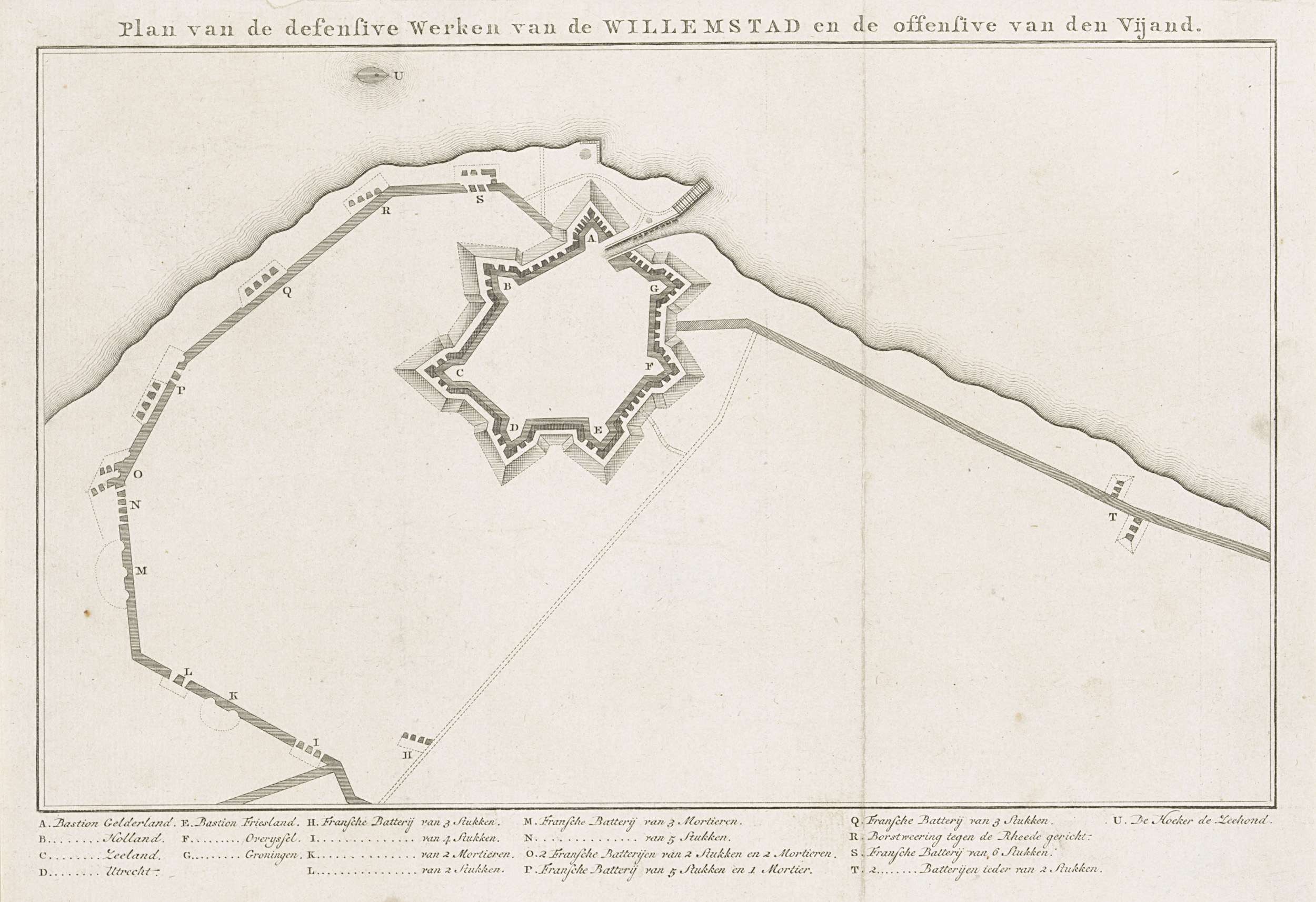 Plattegrond van de fortificaties van Willemstad en de posities van de belegerende Franse revolutionaire troepen, februari 1793. Met legenda A-U.