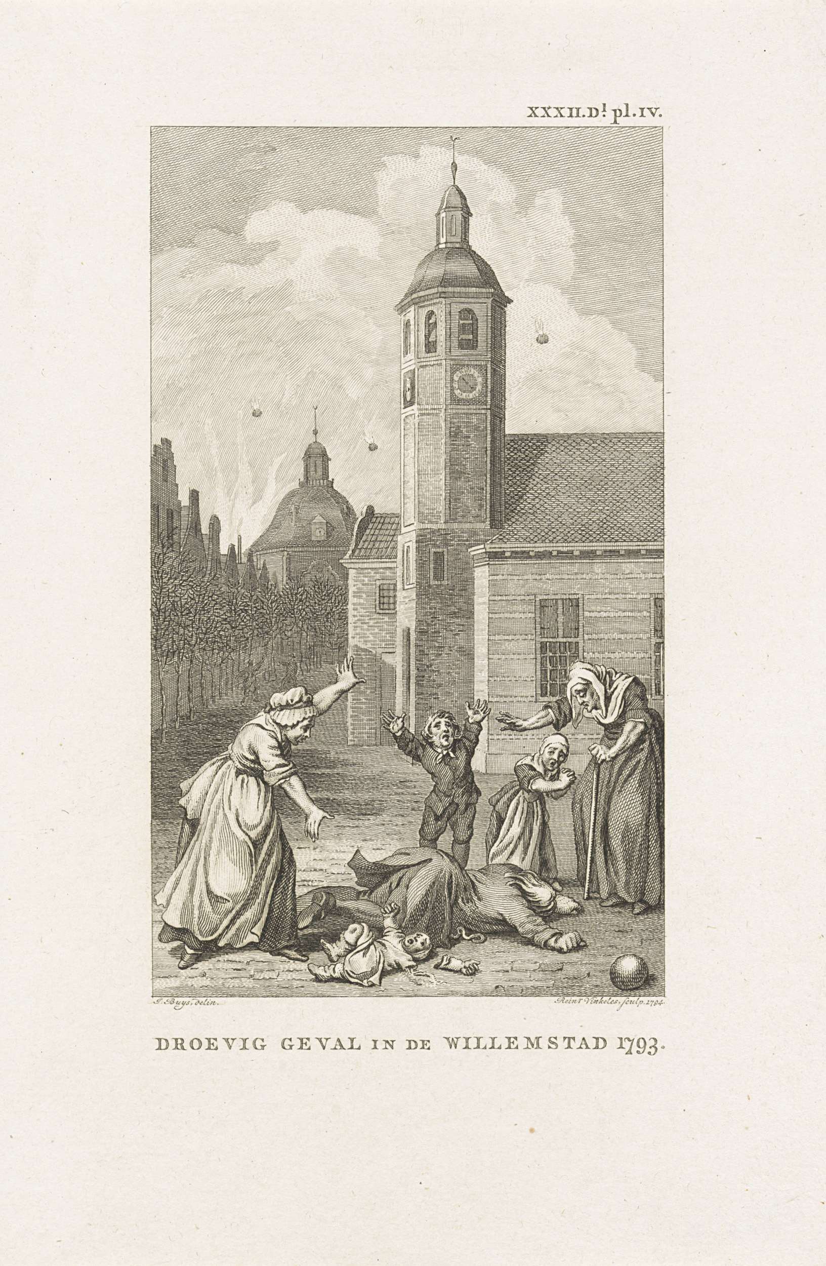 Een man met een klein kind worden getroffen door een Franse granaat. Op de achtergrond het stadhuis en de Koepelkerk. Tijdens het beleg van Willemstad door het Franse leger 27 februari - 15 maart 1793. Genummerd rechtsboven: XXXII.Dl.pl.IV.
