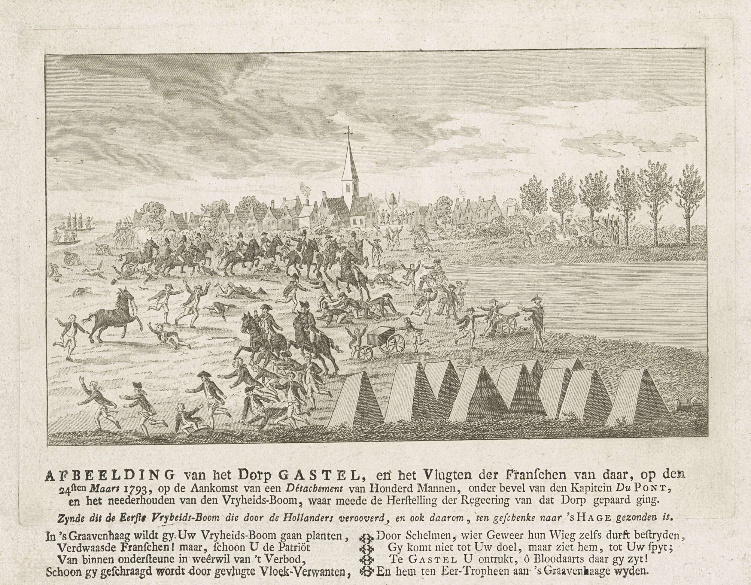 De Franse troepen vluchten uit het dorp Gastel bij de aankomst van een detachement van 100 man onder kapitein Dupont, 24 maart 1793. In het dorp wordt de - door de Fransen opgerichte - vrijheidsboom veroverd, en later naar Den Haag gezonden. Beschrijving en een achtregelig vers op het blad onder de plaat.