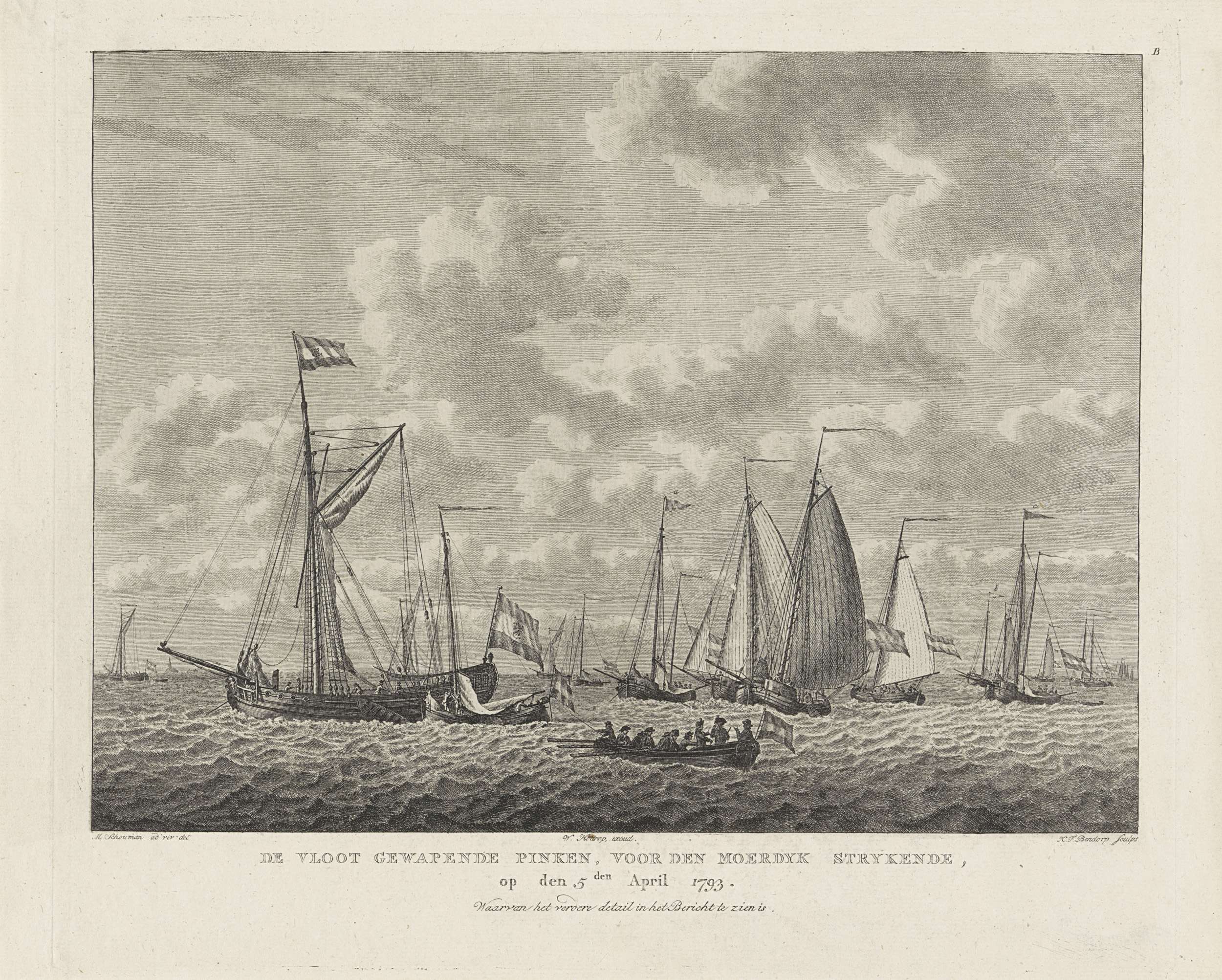 De vloot gewapende pinken strijkt de zeilen bij de Moerdijk, 5 april 1793, als verdediging tegen de Fransen. Gemerkt rechtsboven: B. Zie pendant.