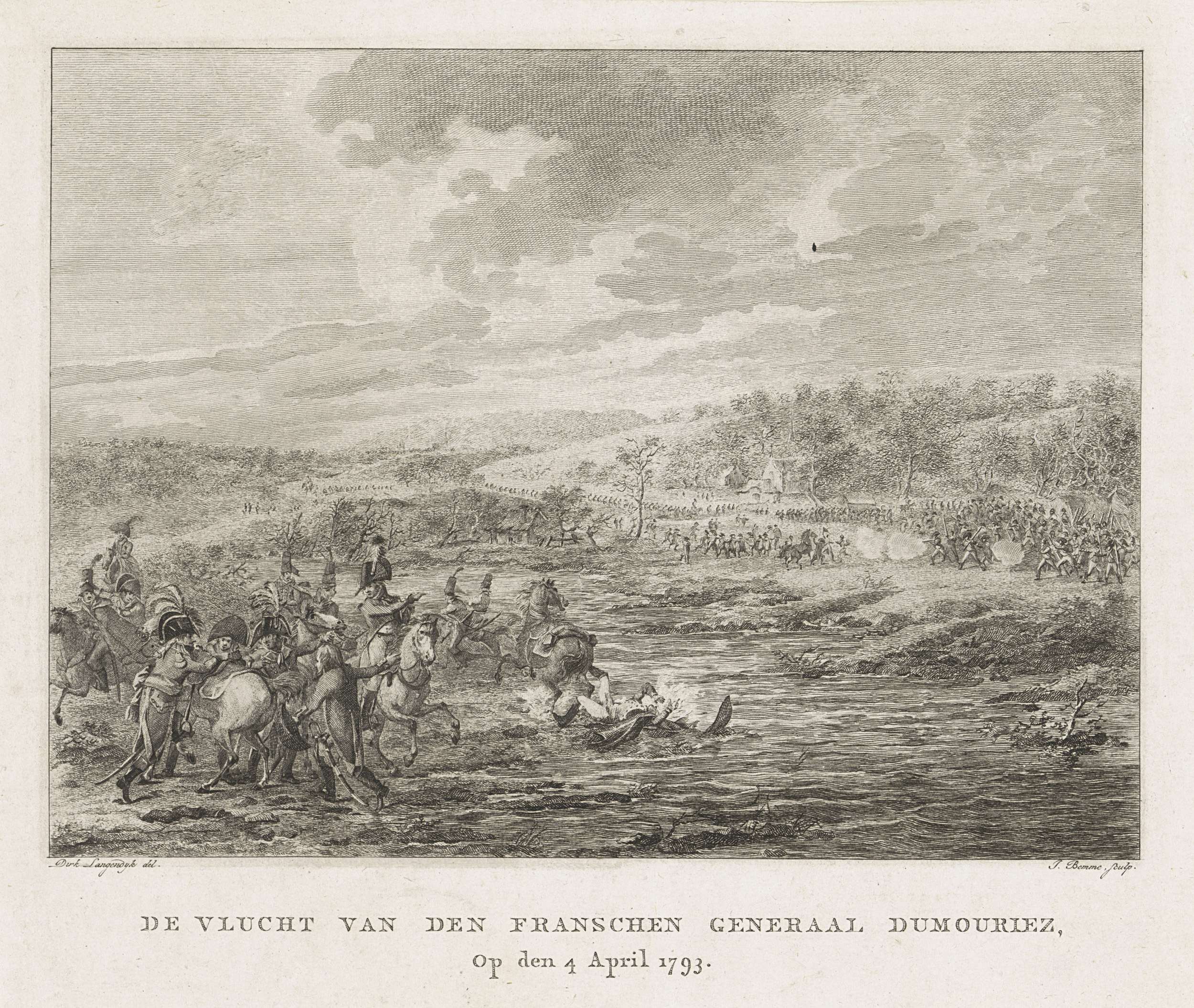 Vlucht van de Franse generaal Dumouriez, 4 april 1793. De generaal steekt met een aantal officieren te paard een riviertje over, achterna gezeten en beschoten door een leger aan de overzijde.