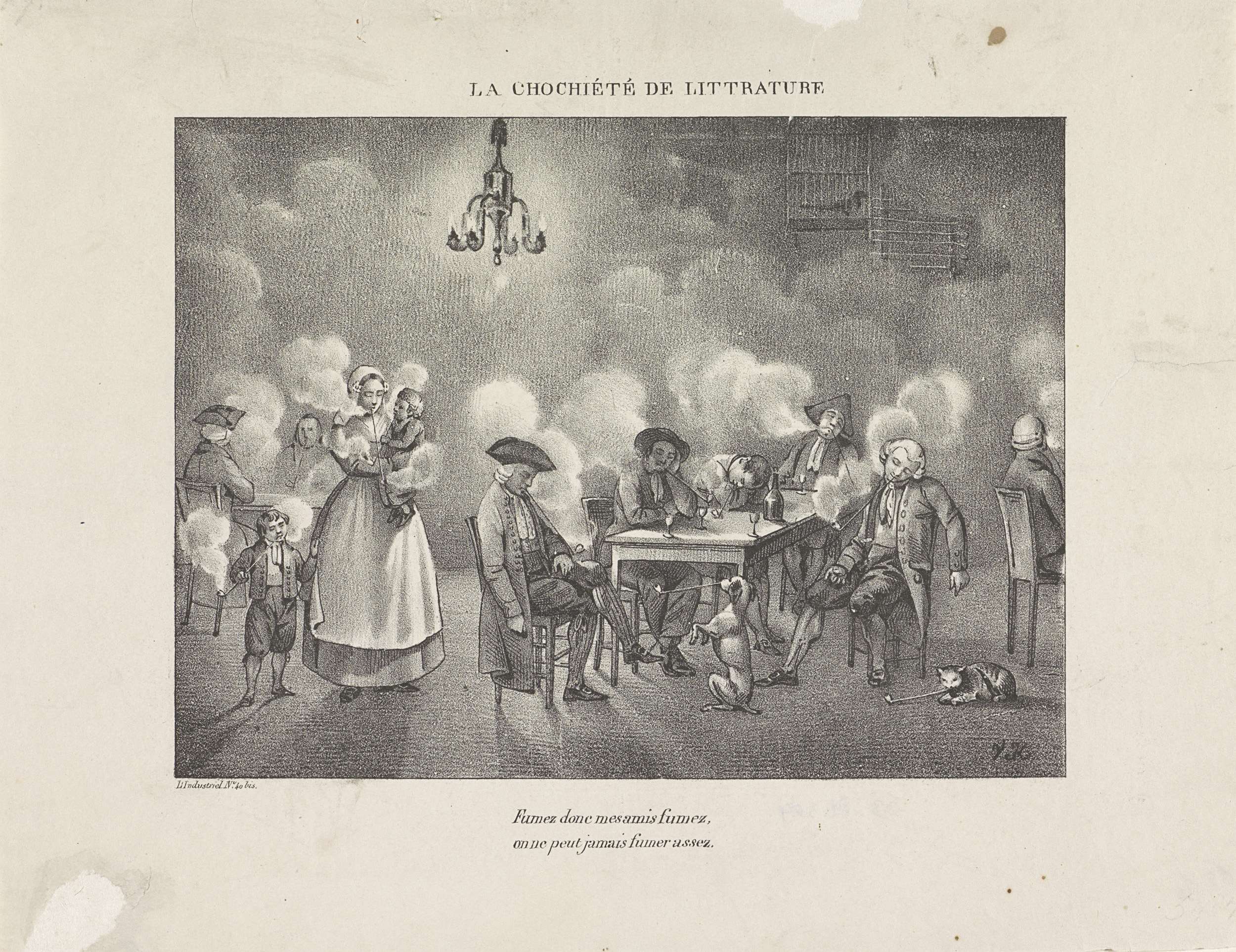 Iedereen rookt, zelfs kinderen en huisdieren. Sommigen hebben moeite om wakker te blijven. Kortom, niet bepaald sociaal geaccepteerd gedrag. In België werden in de 19de eeuw sociëteiten ter bestudering van Nederlandse taal- en letterkunde opgericht. De kritiek was echter dat er in de praktijk weinig bestudeerd werd. Hiernaar verwijzen ook de spelfouten in de titel, ...
