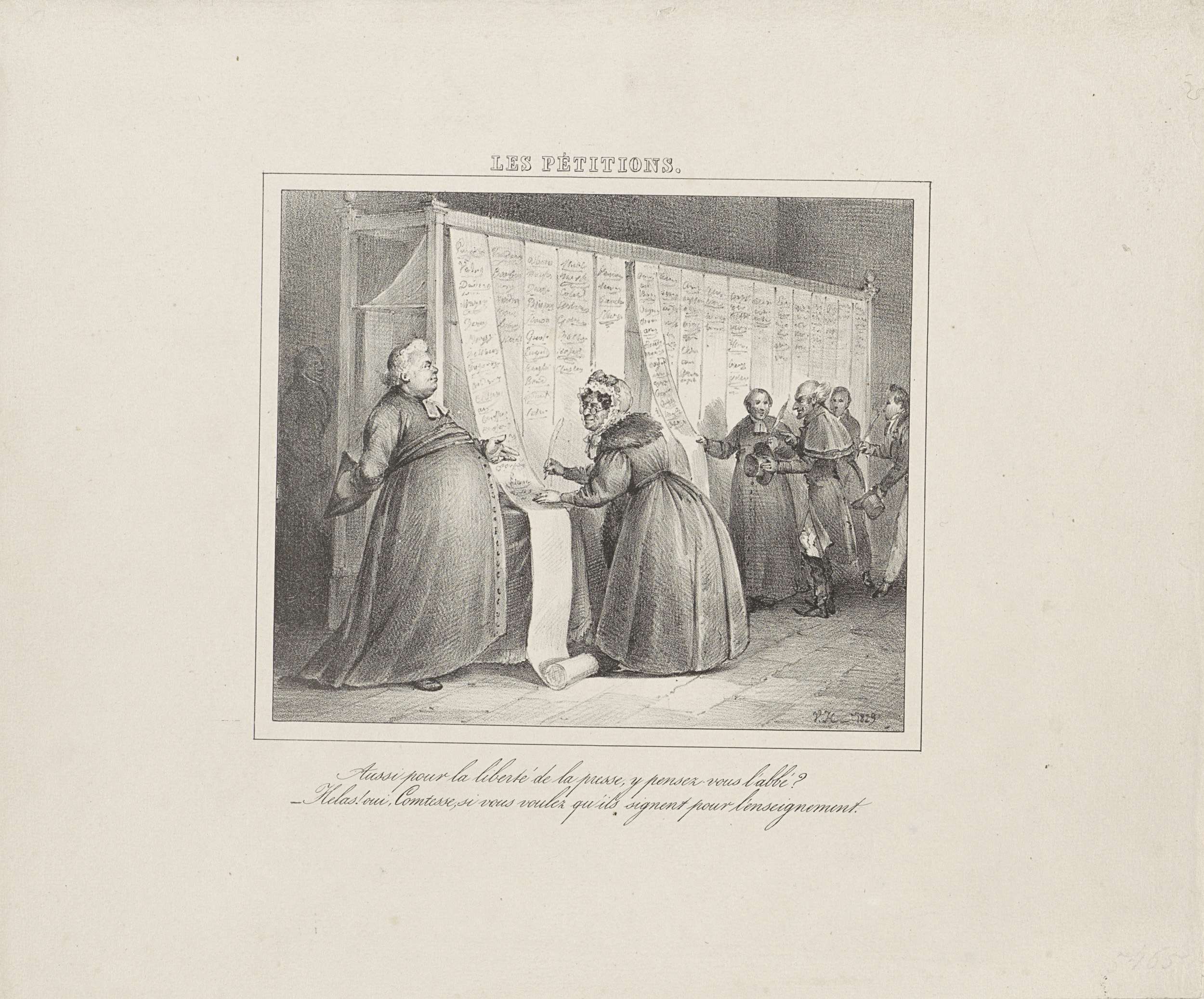 Spotprent op de Belgische petities ter verkrijging van vrijheid van onderwijs voor de klerikale partij en vrijheid van drukpers voor de liberale partij in november 1828. Belangstellenden zetten hun handtekening op lange stroken papier. Met tweeregelig Frans onderschrift.