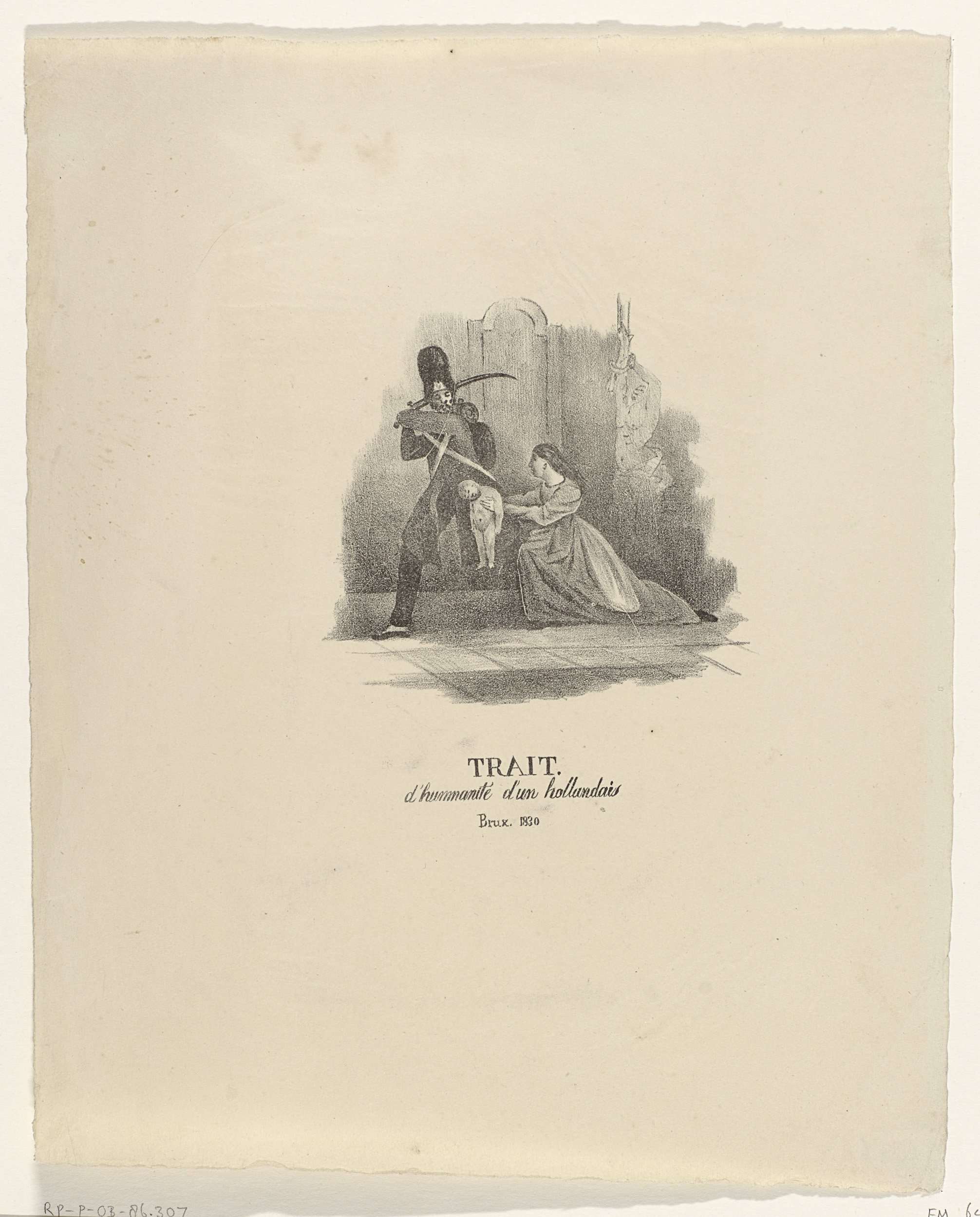Een Nederlandse soldaat op het punt om het naakte kind van een vrouw met de sabel te doden. Anti-Nederlandse voorstelling naar aanleiding van de wreedheden bedreven door de Nederlanders in Brussel in september 1830.
