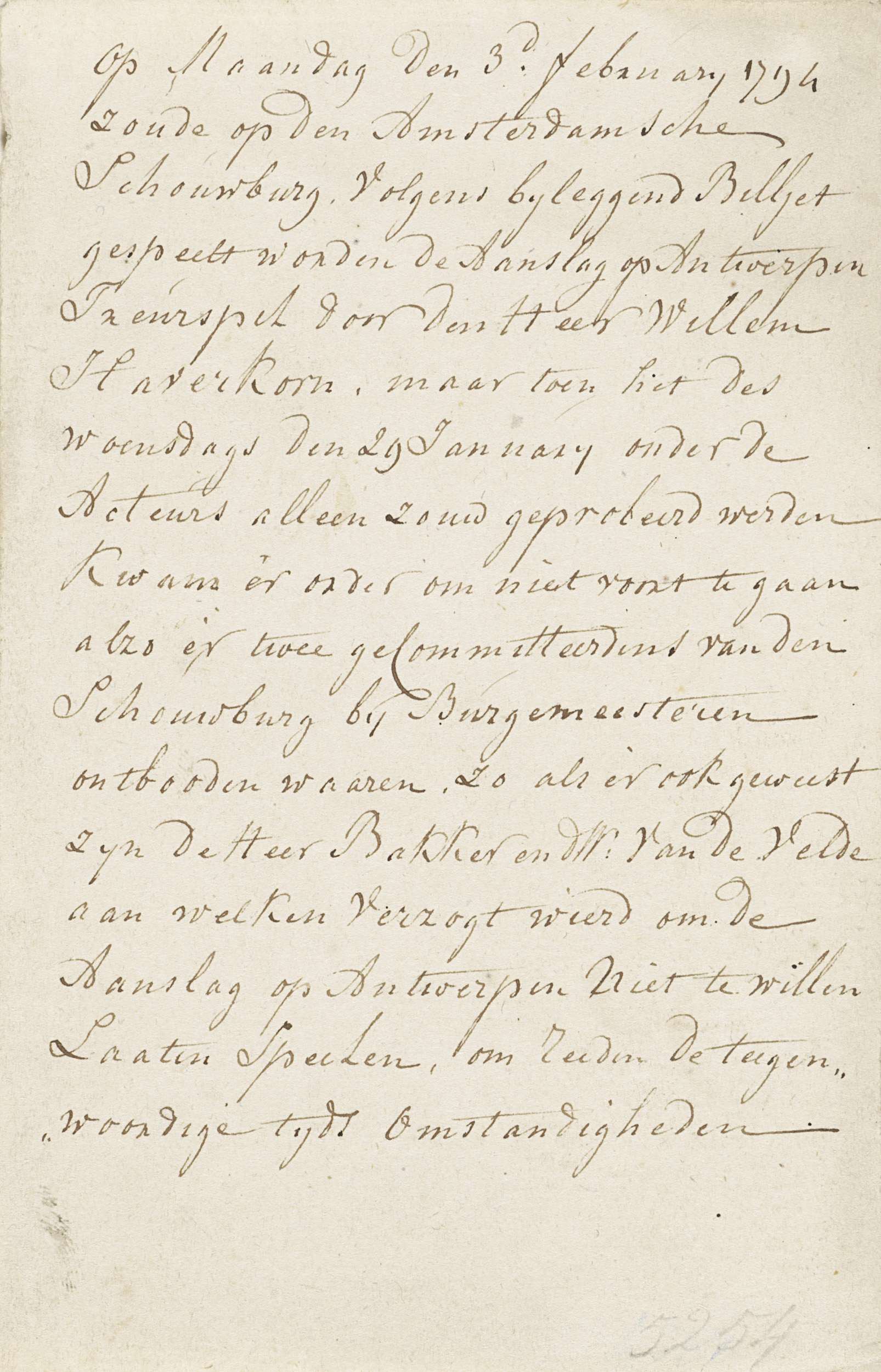 Blad met een handschrift over het niet doorgaan van de opvoering van het toneelstuk 'De Aanslag op Antwerpen' door Willem Haverkorn, op 3 februari 1794 in de Schouwburg te Amsterdam, wegens 'de tegenwoordige tijds omstandigheden'.