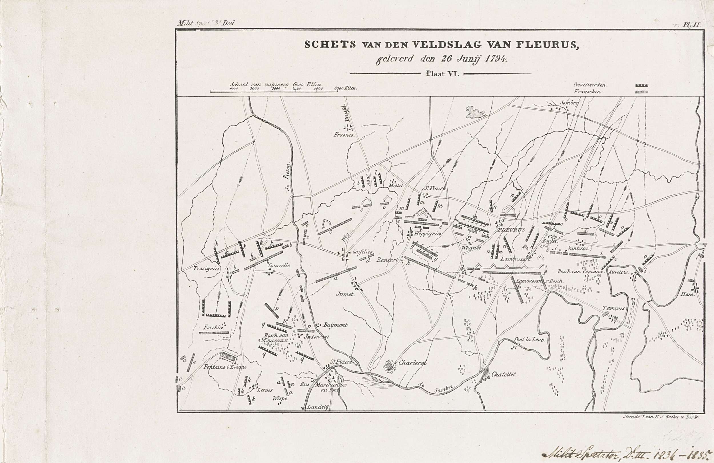 Kaart met de posities van de Geallieerde en Franse legers tijdens de slag bij Fleurus, 26 juni 1794. Franse overwinning op de Oostenrijkers. Gemerkt bovenaan: Milit. Spectr. IIIde Deel / Pl: II.