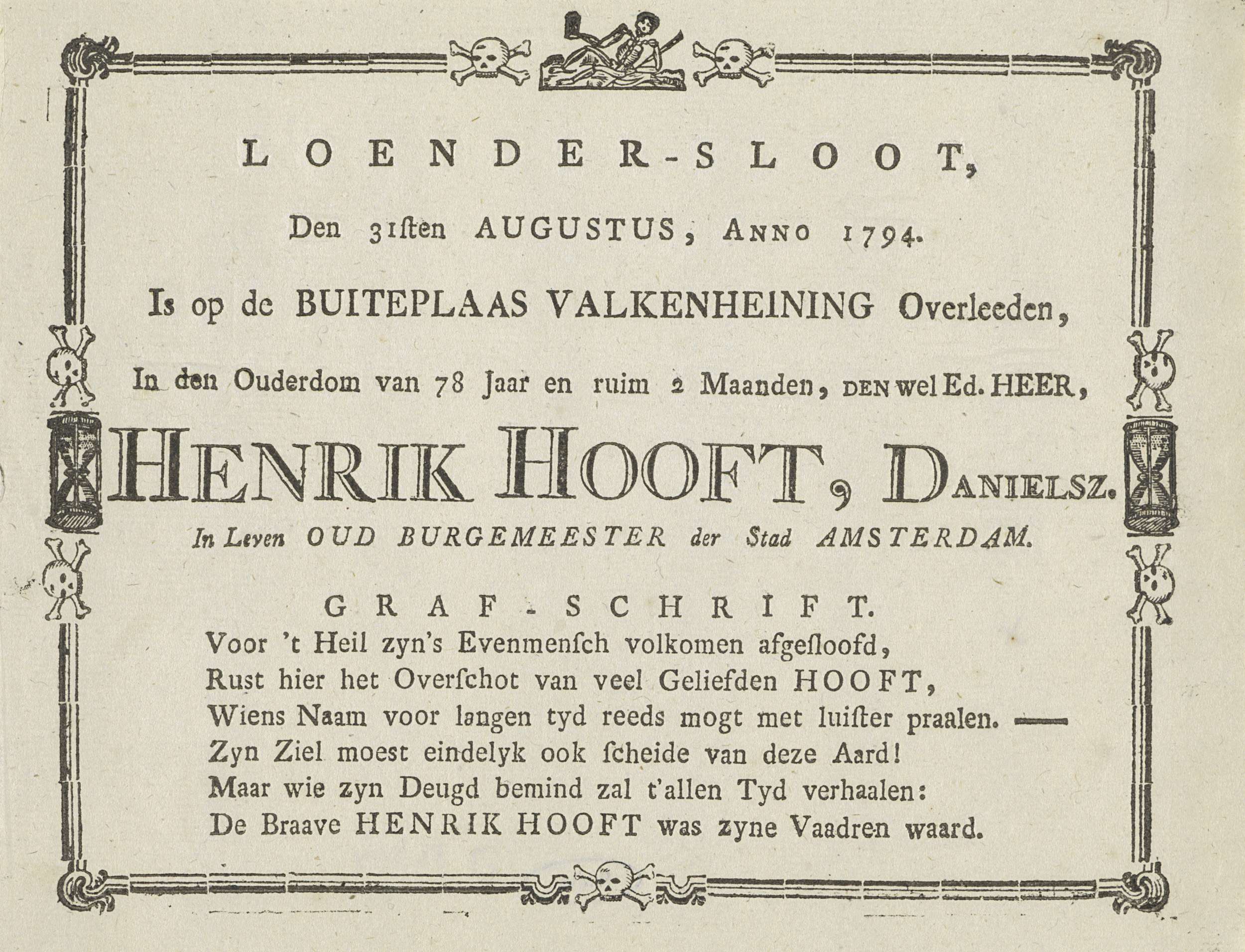Bekendmaking van het overlijden van Hendrik Danielsz. Hooft, oud-burgemeester van Amsterdam, op 31 augustus 1794 op de buitenplaats Valkenheining te Loenersloot. Tekst met een zesregelig vers binnen een versierde rand.