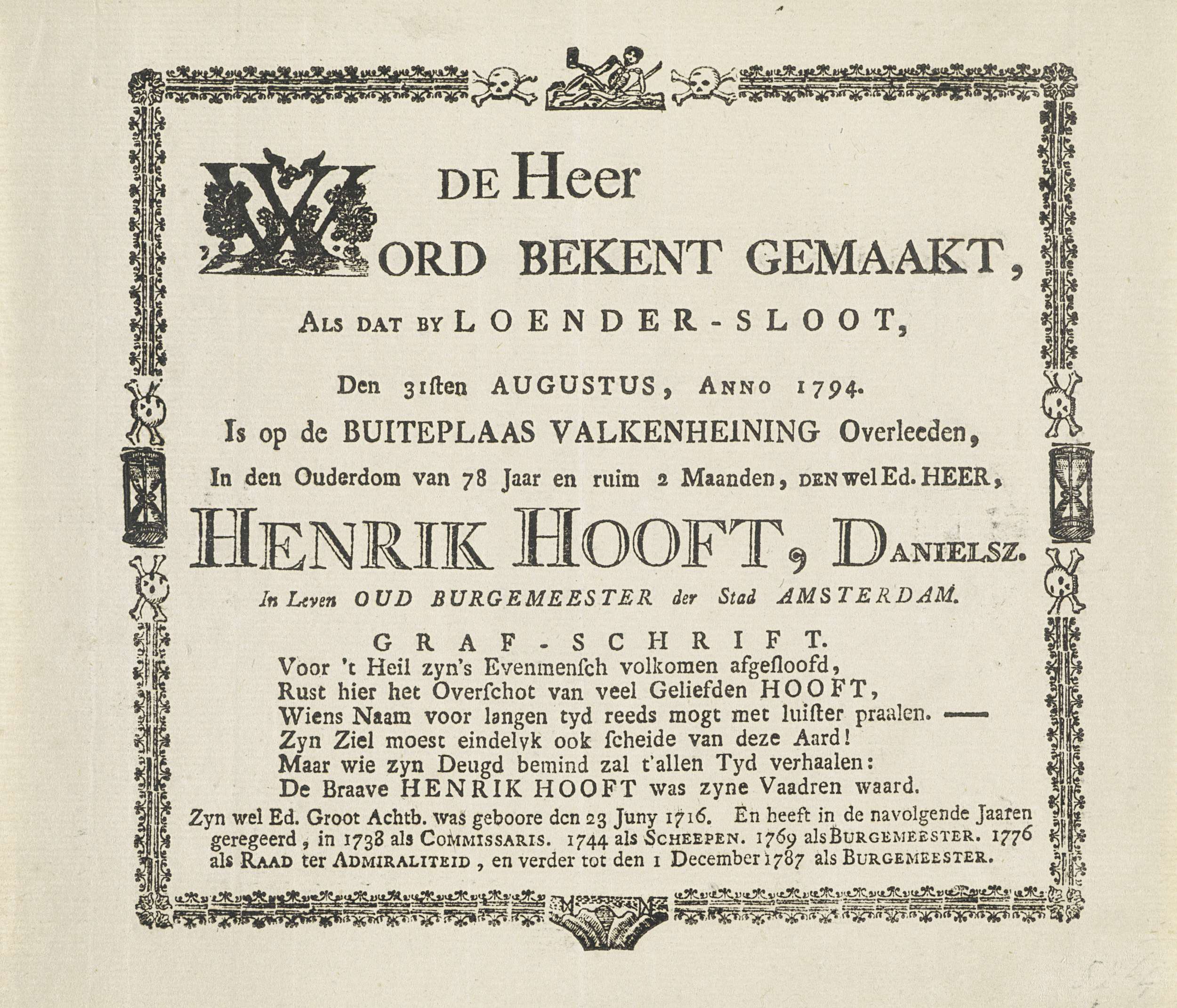 Bekendmaking van het overlijden van Hendrik Danielsz. Hooft, oud-burgemeester van Amsterdam, op 31 augustus 1794 op de buitenplaats Valkenheining te Loenersloot. Tekst met een zesregelig vers binnen een versierde rand.