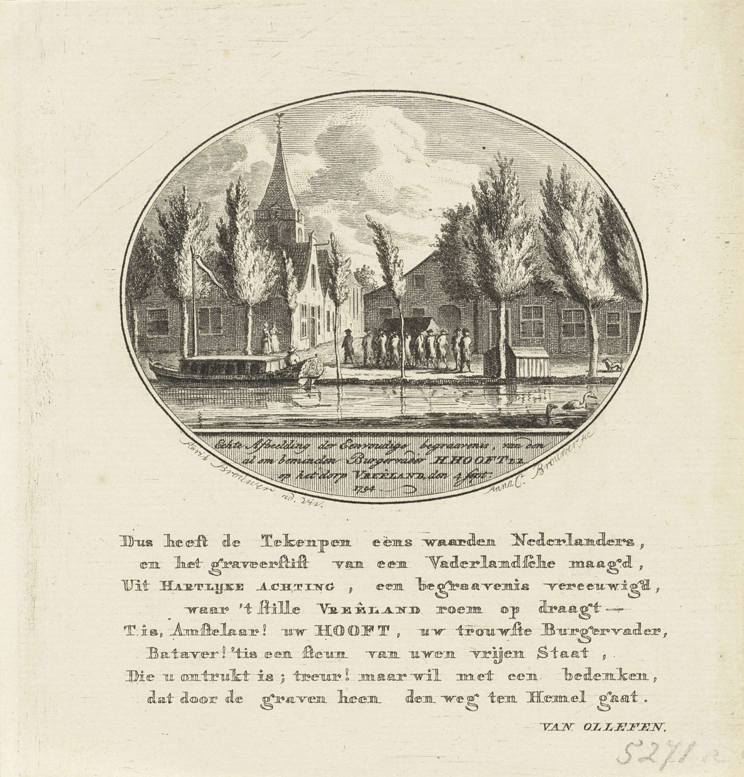 Begrafenis van Hendrik Danielsz. Hooft, oud-burgemeester van Amsterdam, overleden op 31 augustus en begraven op 4 september 1794 in de Hervormde Kerk in Vreeland. Ovale voorstelling met achtregelig vers. De kist wordt langs de Vecht, waar de Statenjacht aangemeerd ligt, naar de kerk gedragen.