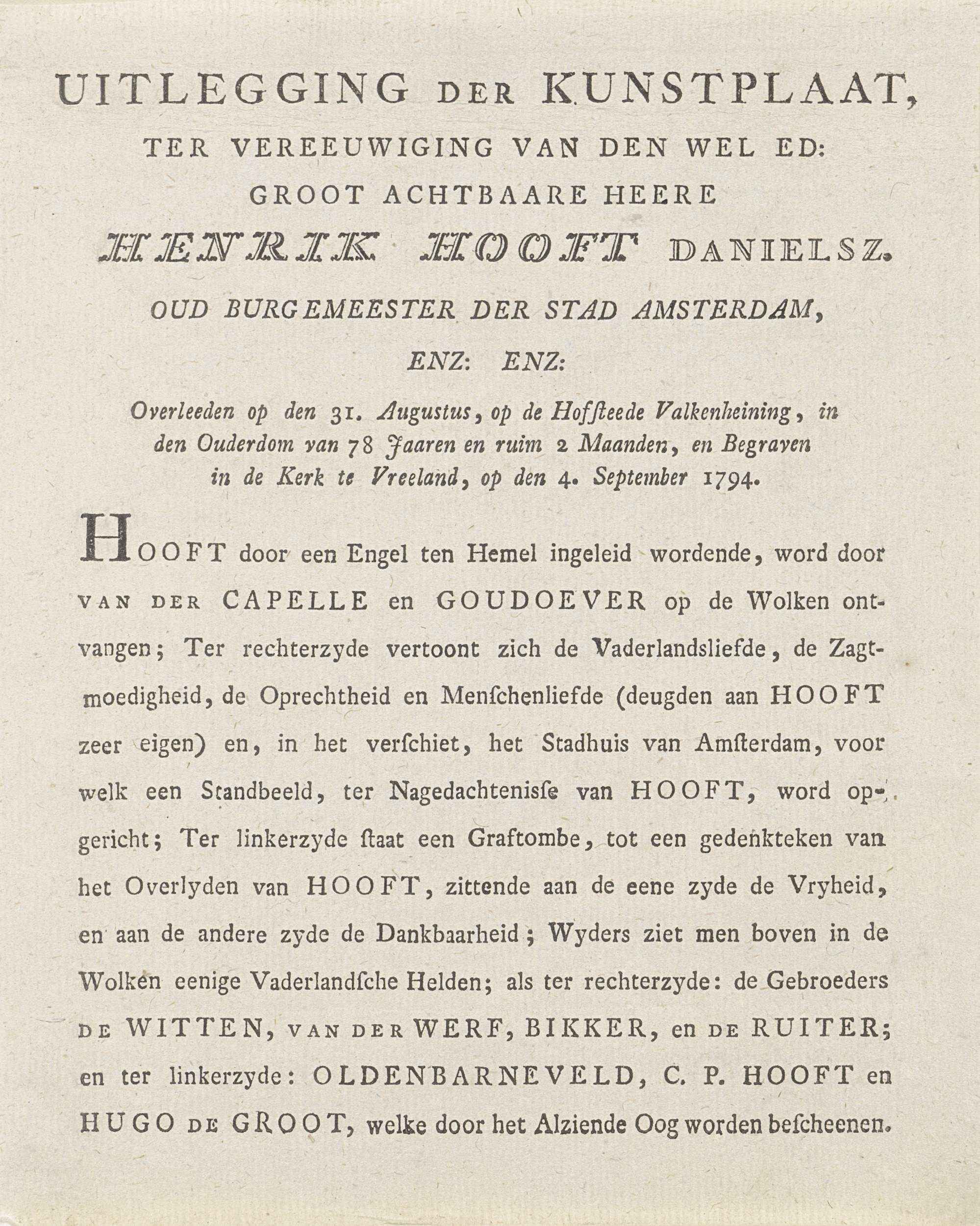 Verklaring van de prent van de hemelvaart van Hendrik Danielsz. Hooft, 1794