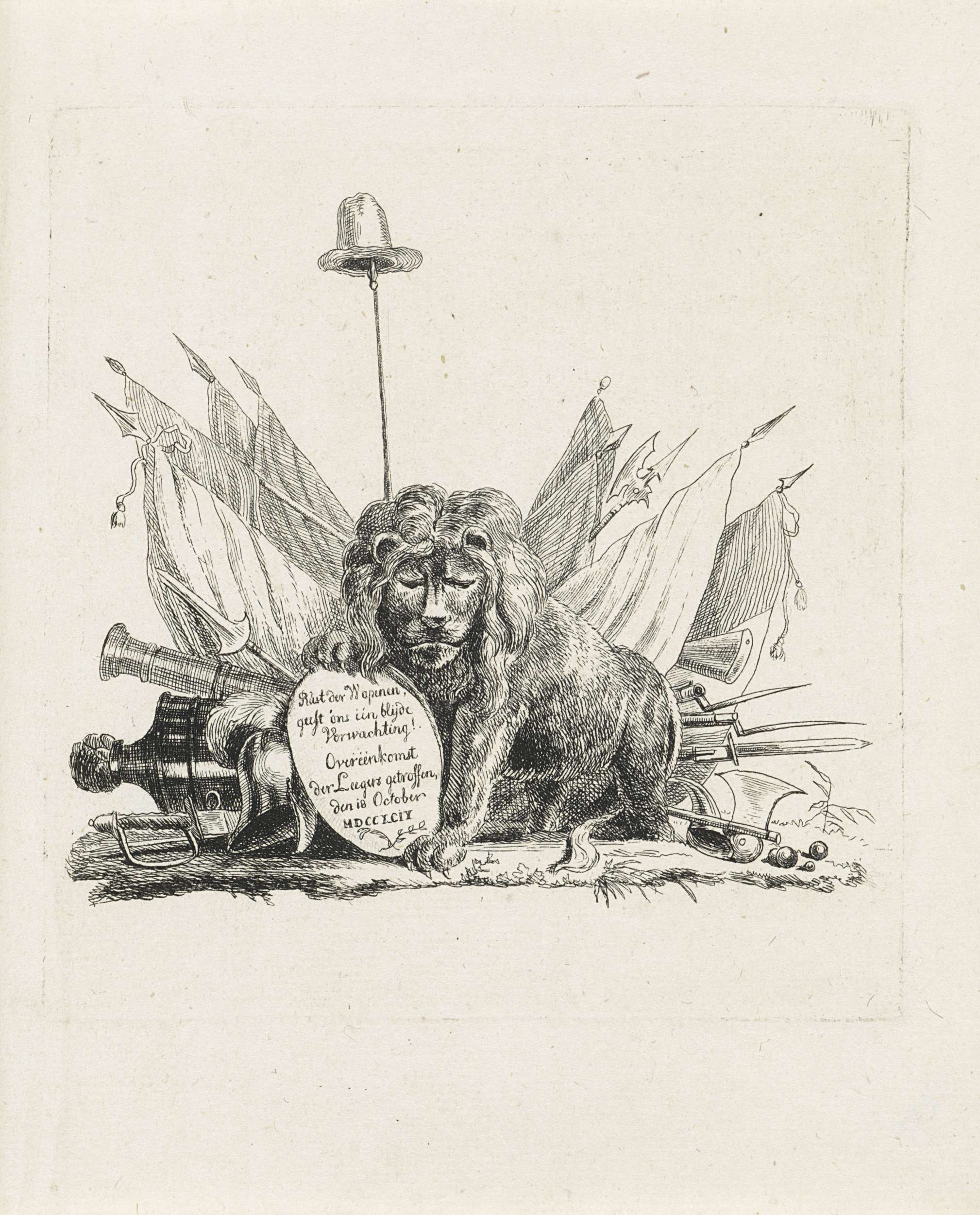 Vignet met de Nederlandse Leeuw voor een wapentrofee met vaandels en de vrijheidshoed. In de poten van de leeuw een schild met een opschrift over een wapenstilstand bereikt op 18 oktober 1794 (tussen Groot-Brittannië en Frankrijk).