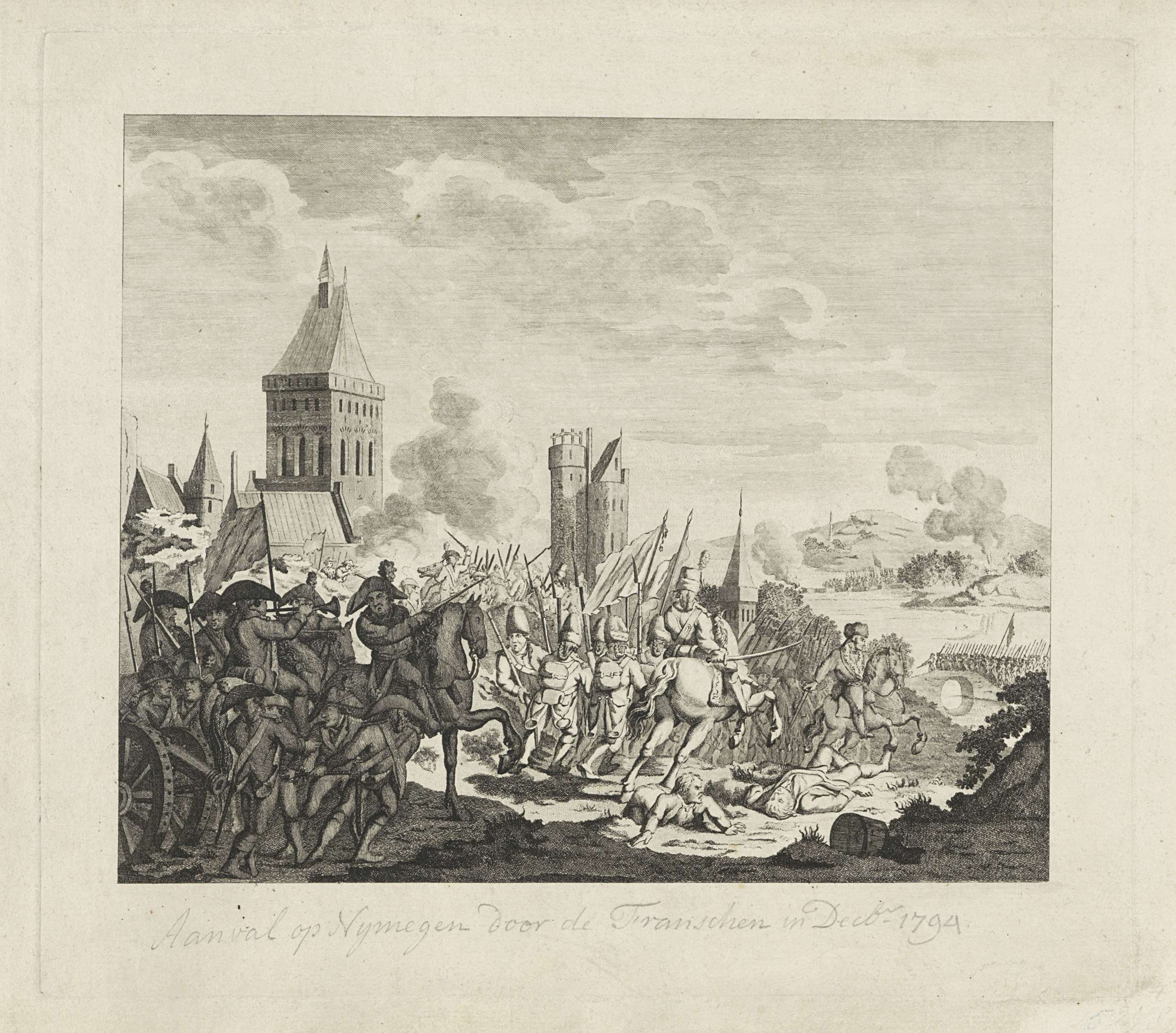 Franse troep dringen door de Molenpoort de stad Nijmegen binnen, 6-7 november 1794. Rechts in de verte de vertrekkende Britse troepen.