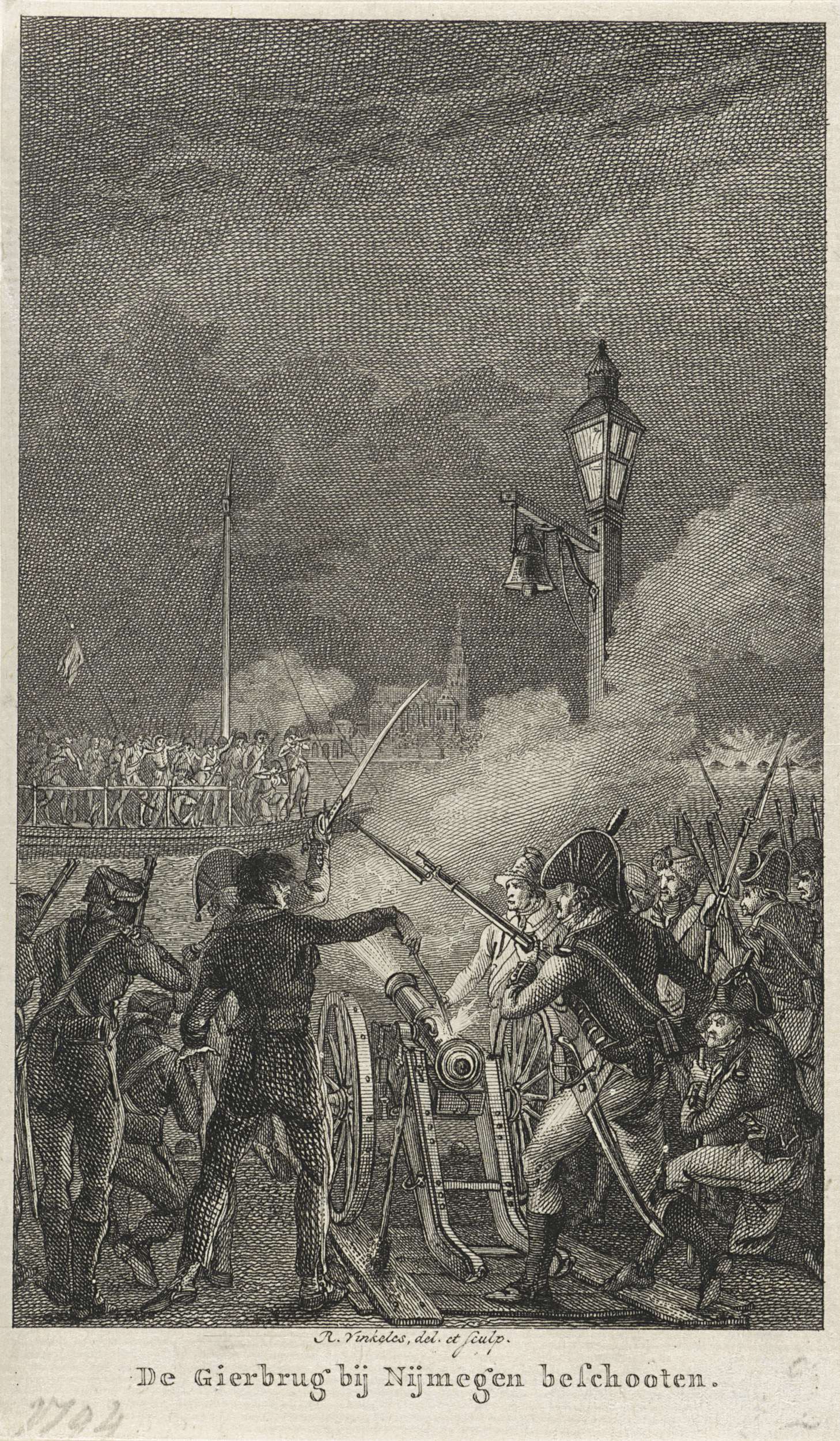 Fransen troepen beschieten de vluchtende Hollandse en Britse troepen die via de schipbrug de Gierbrug over de Waal de overzijde proberen te bereiken, 7 november 1794.