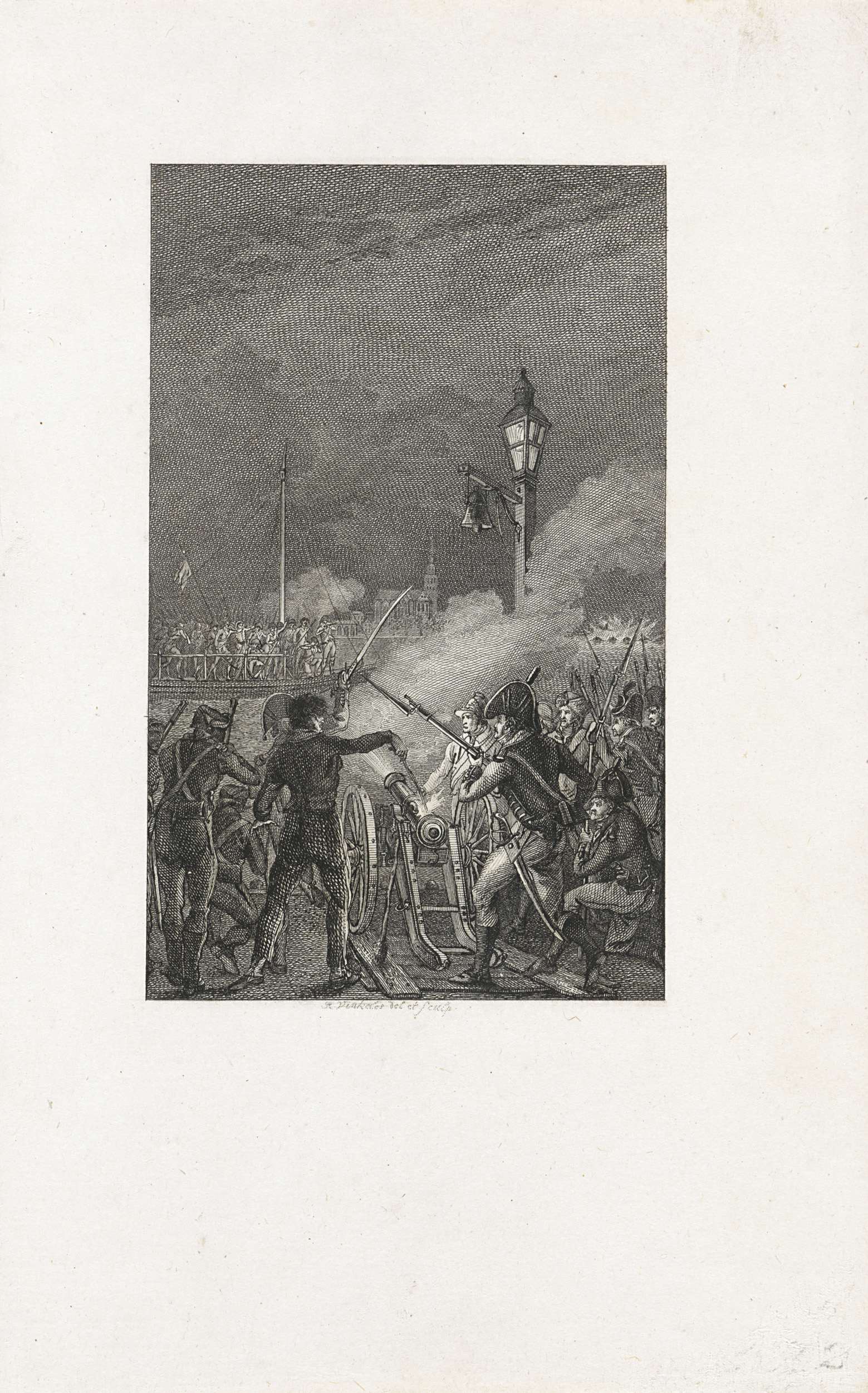 Fransen troepen beschieten de vluchtende Hollandse en Britse troepen die via de schipbrug de Gierbrug over de Waal de overzijde proberen te bereiken, 7 november 1794.