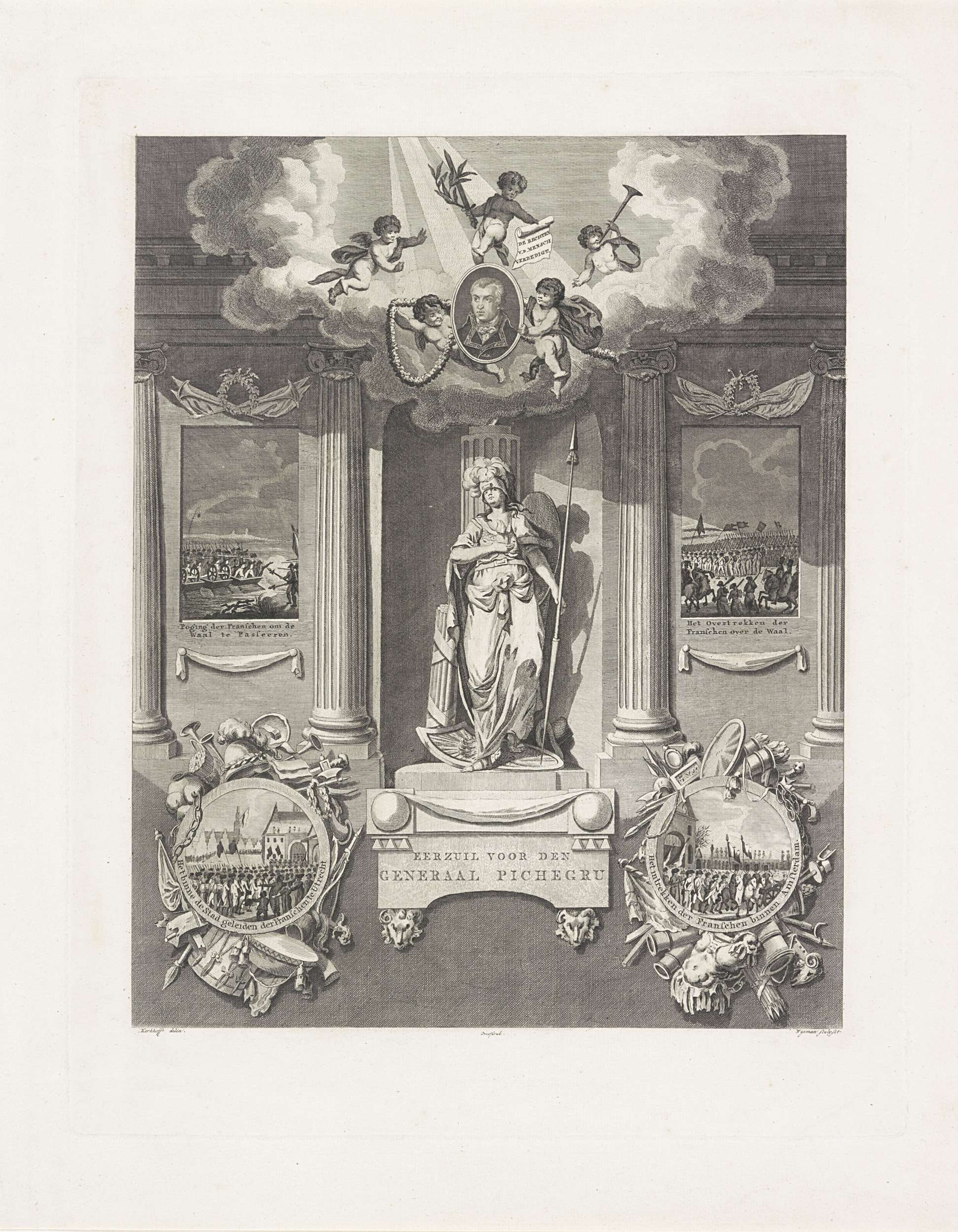 Allegorisch monument voor de Franse generaal Pichegru. Centraal een standbeeld van de Vrijheid, bovenaan putti met een portret van Pichegru. Aan weerszijden cartouches met episodes uit de inval van de Fransen in 1795: het oversteken van de Waal en binnentrekken van Utrecht en Amsterdam.