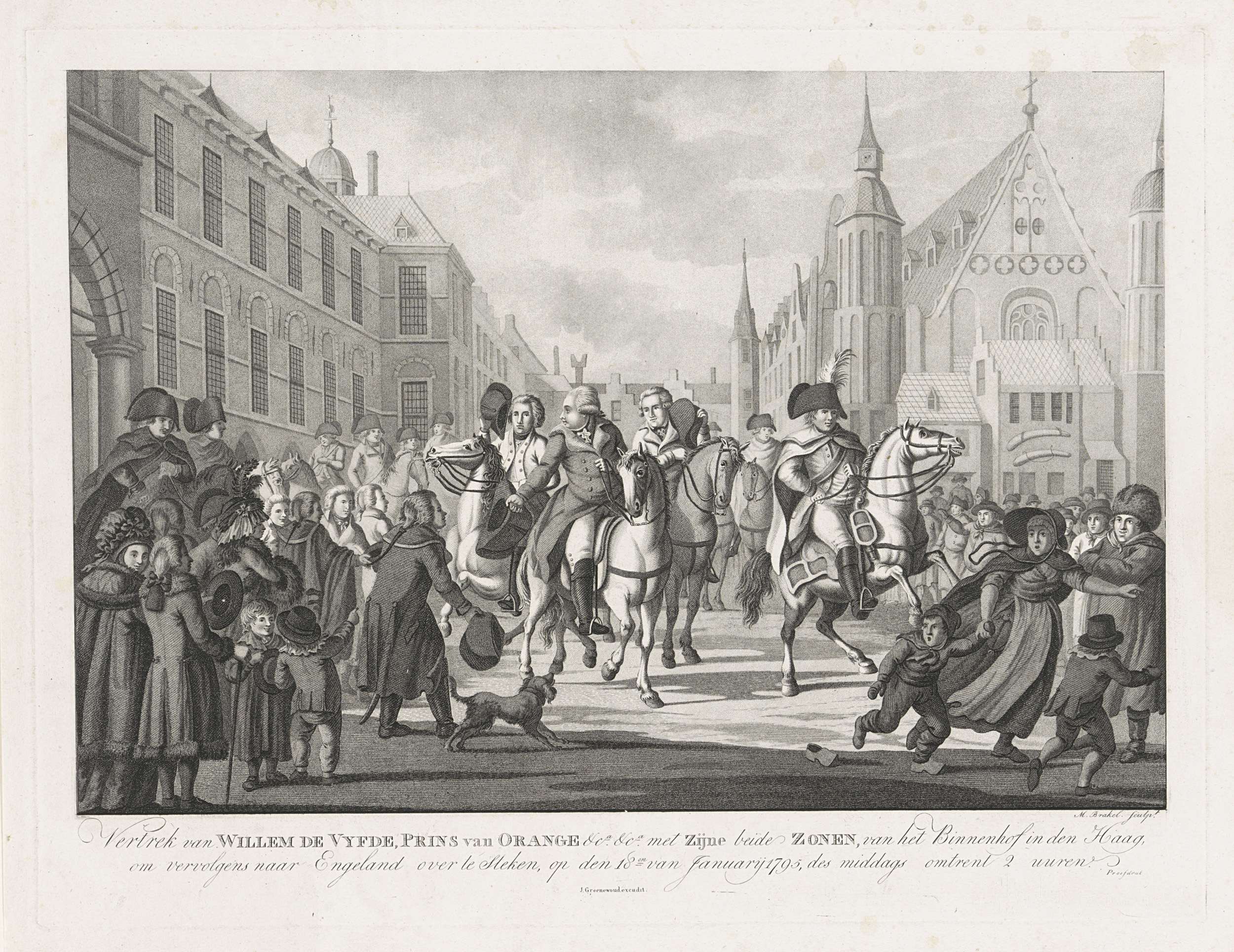 Vertrek van prins Willem V met zijn zoons vanaf het Binnenhof in Den Haag naar Scheveningen om vandaar verder naar Engeland te reizen, 18 januari 1795. Het gezelschap te paard te midden van het toegestroomde publiek. Zie pendant met het vertrek van prinses Wilhelmina uit Schevenigen.