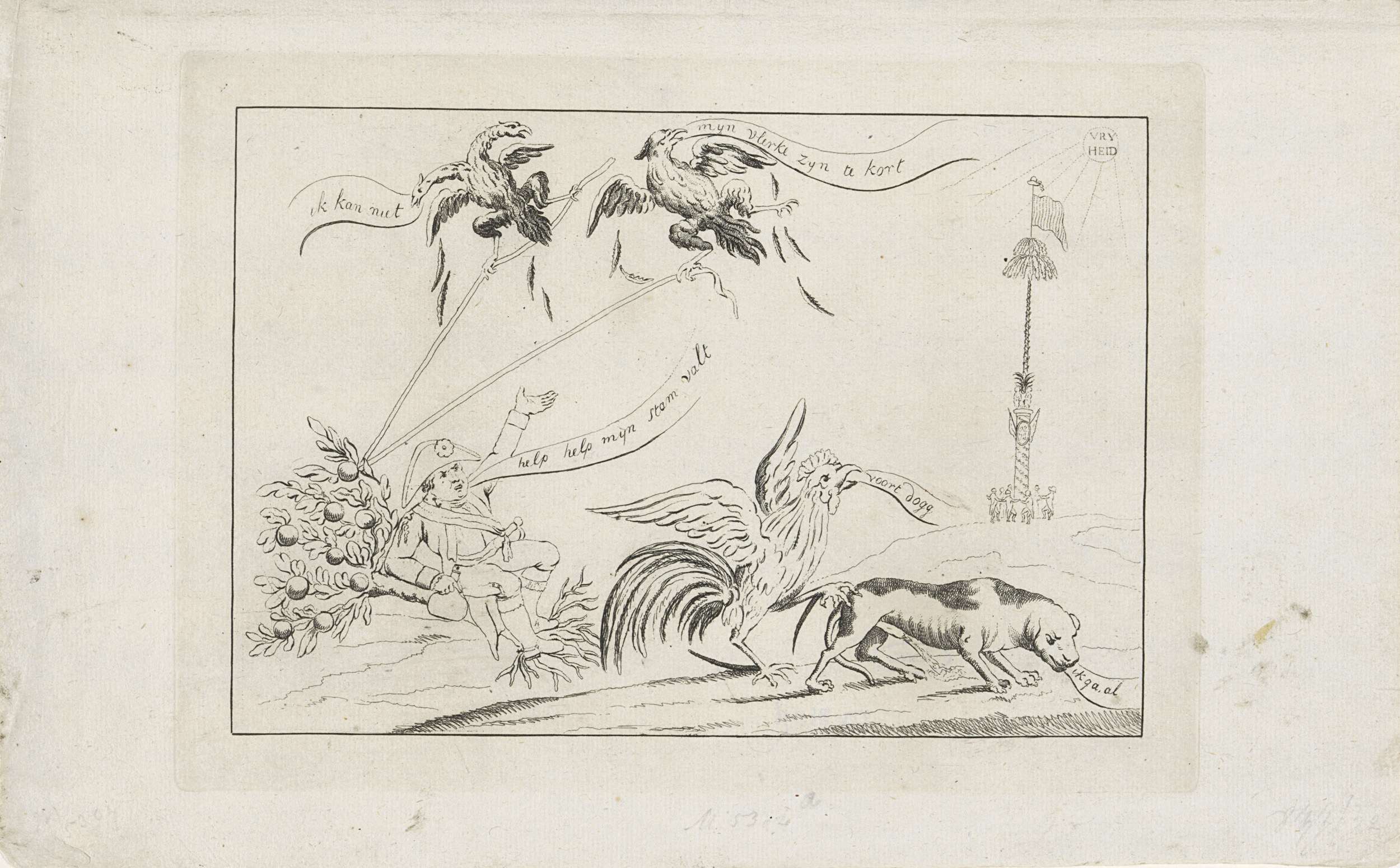 Spotprent op het vertrek van stadhouder Willem V naar Engeland op 18 januari 1795. Willem V roept om hulp bij een omgevallen Oranjeboom, de Oostenrijkse en Pruisische adelaars proberen tevergeefs de boom overeind te houden. Op de voorgrond verjaagt de Franse haan de Engelse dog, op de achtergrond dansen burgers om de vrijheidsboom in het ...