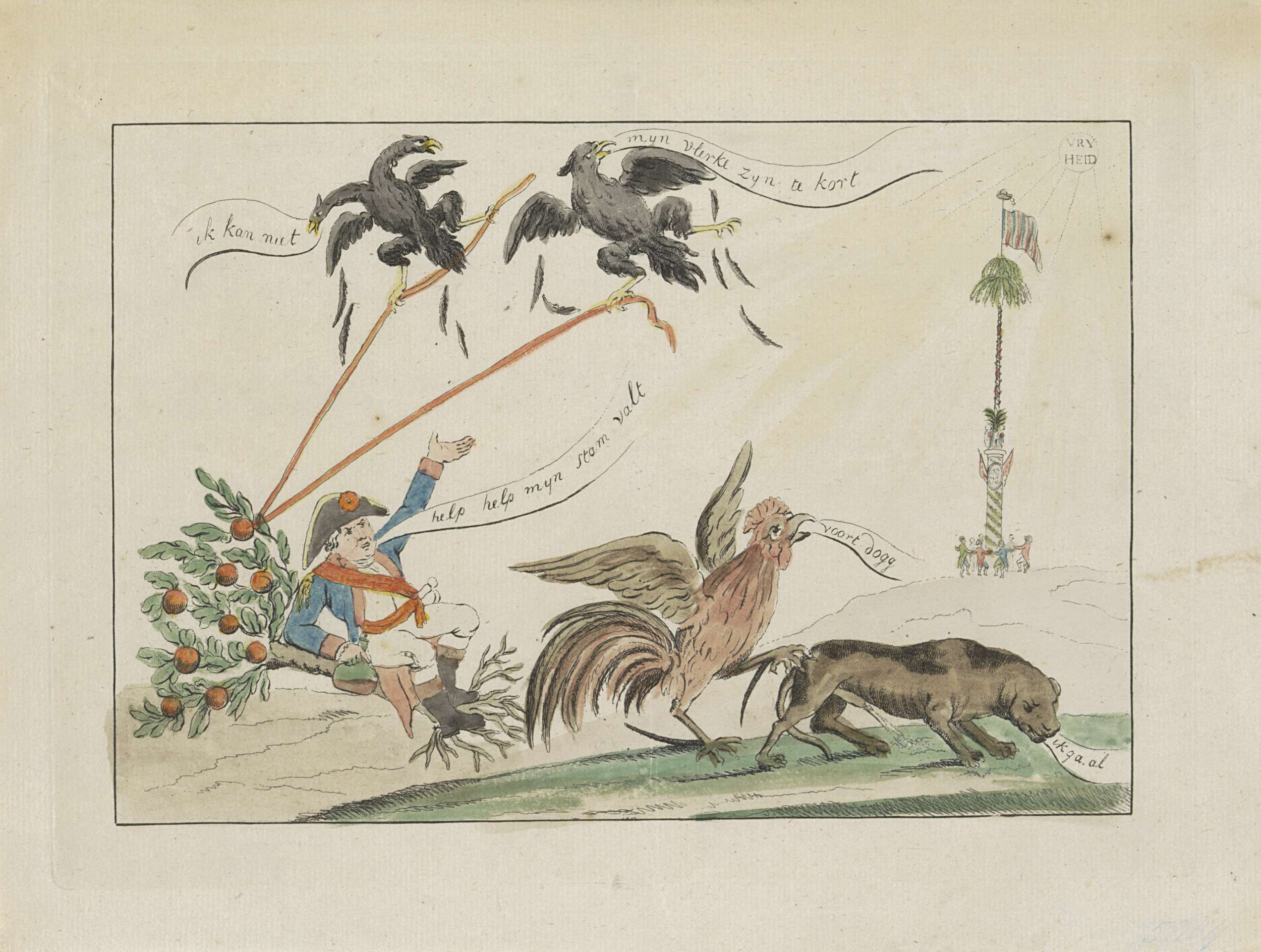 Spotprent op het vertrek van stadhouder Willem V naar Engeland op 18 januari 1795. Willem V roept om hulp bij een omgevallen Oranjeboom, de Oostenrijkse en Pruisische adelaars proberen tevergeefs de boom overeind te houden. Op de voorgrond verjaagt de Franse haan de Engelse dog, op de achtergrond dansen burgers om de vrijheidsboom in het ...
