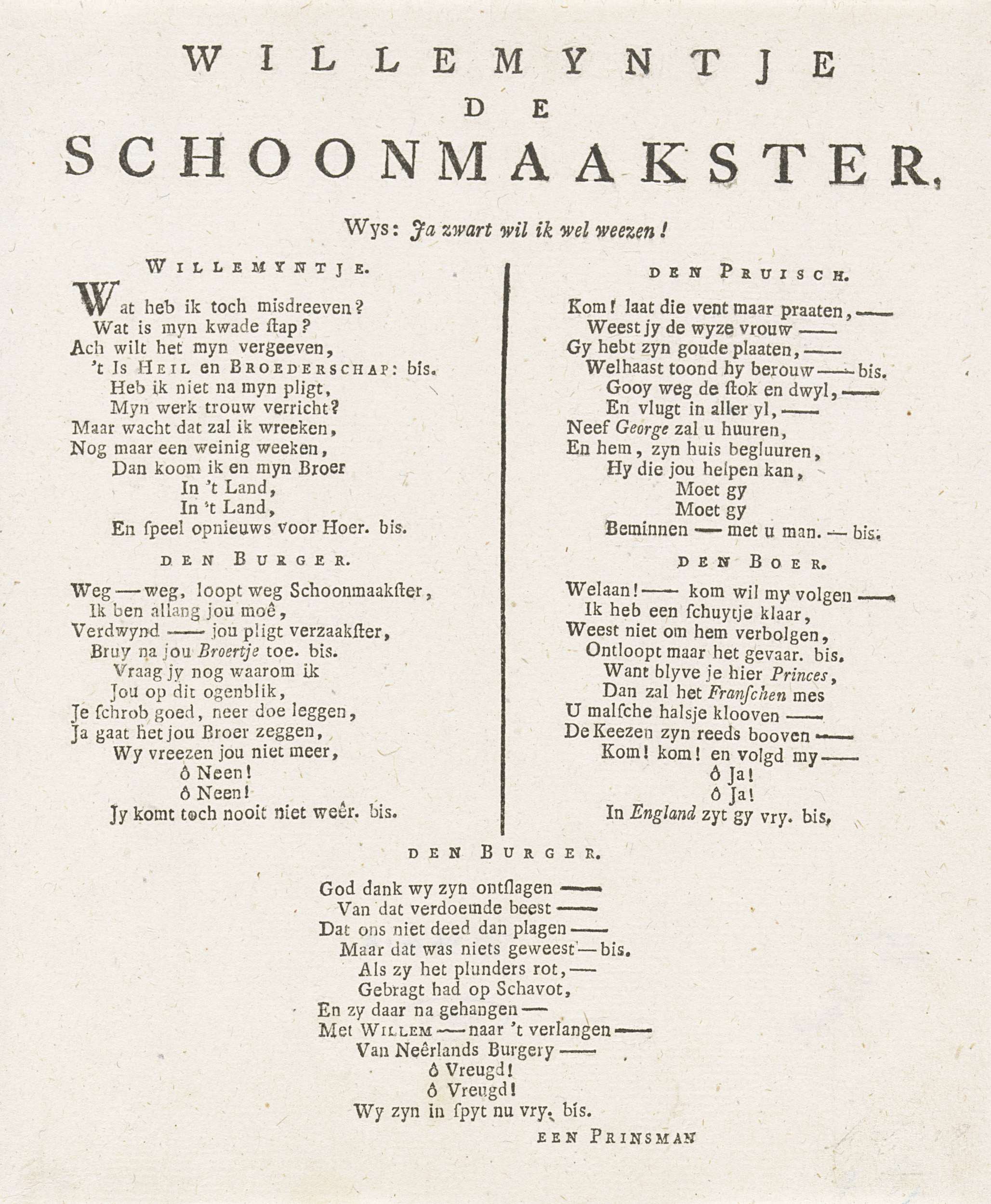 Tekstblad met de vijf verzen van een lied behorend bij de spotprent waarin prinses Wilhelmina van Pruisen als schoonmaakster het huis wordt ontslagen en weggejaagd door een Patriot, 1795.