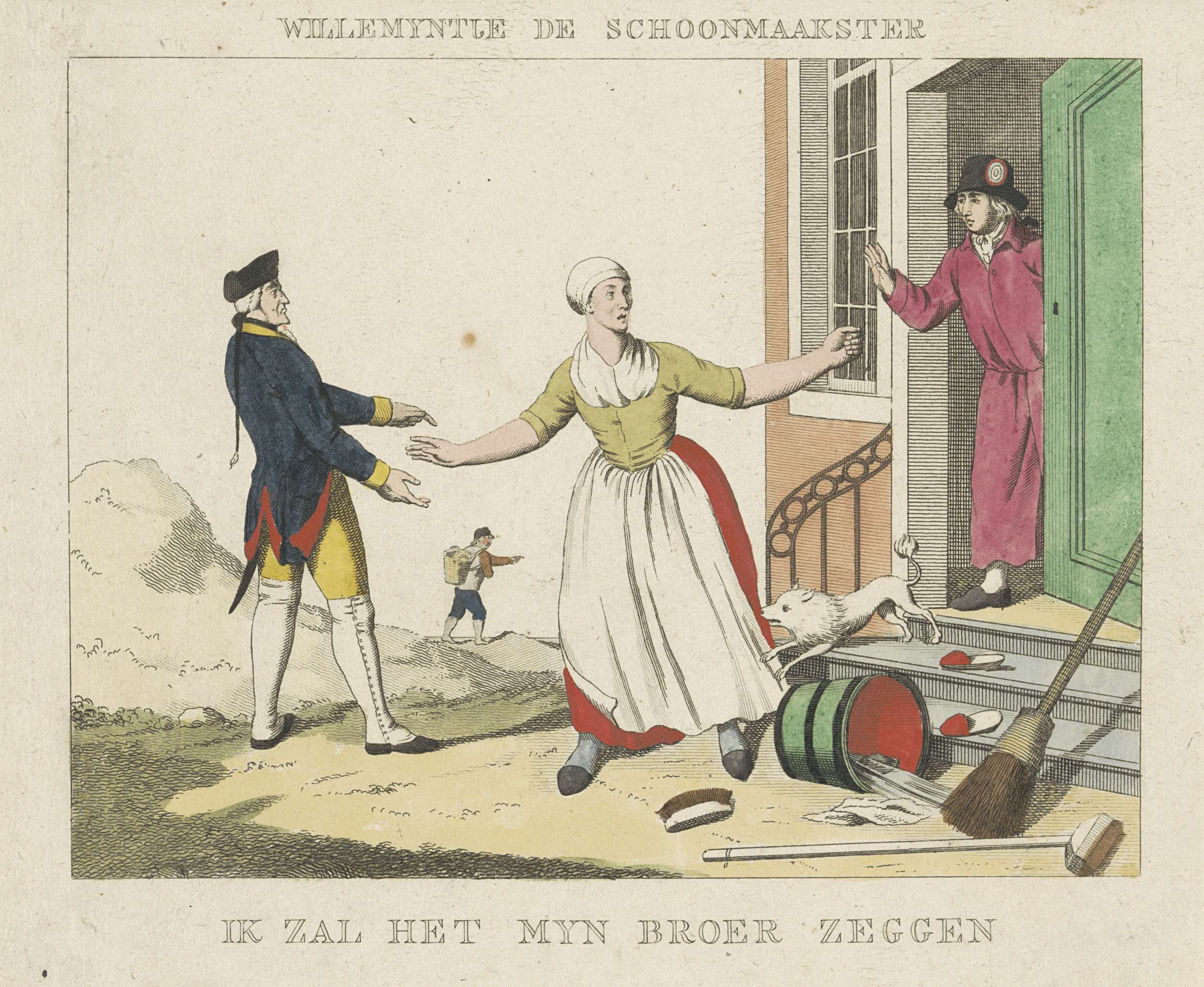 Spotprent waarin prinses Wilhelmina van Pruisen als schoonmaakster het huis wordt ontslagen en weggejaagd door een Patriot, een keeshond blaft naar haar. Links kijkt een Pruisische soldaat verwonderd toe. Op de achtergrond wijst de Scheveningse koopman met landzaten naar zee. Naar aanleiding van de vlucht van de prins en prinses naar Engeland in januari 1795. ...