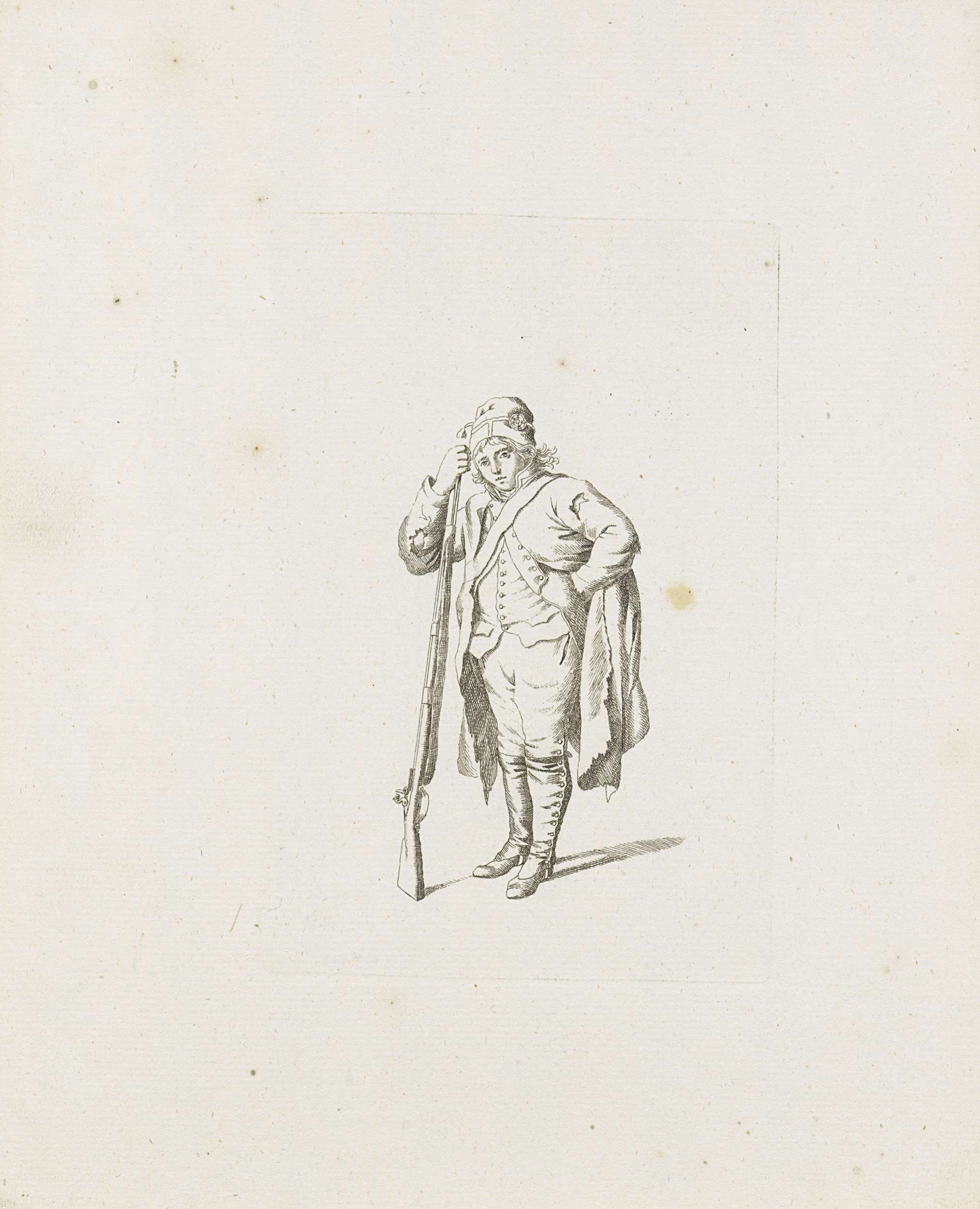 Een staande Franse soldaat, geweer rustende op de grond. Onderdeel van een serie van vijftien platen van Franse infanterie, vooral soldaten en enkele officieren, in ongeregelde uniform of kleding, zoals deze in 1795 in de Republiek aankwam.