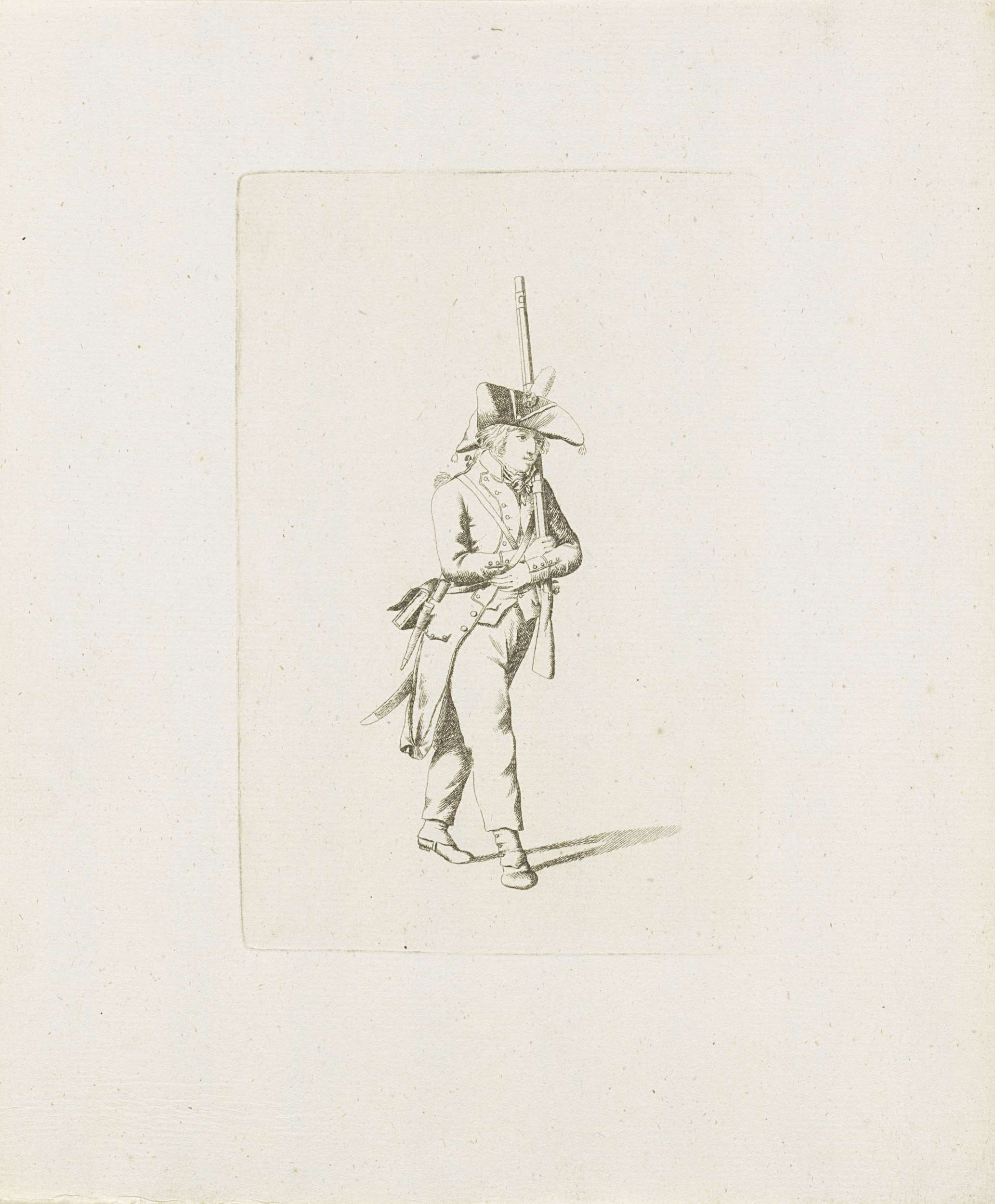 Een Franse soldaat, lopend naar rechts. Onderdeel van een serie van vijftien platen van Franse infanterie, vooral soldaten en enkele officieren, in ongeregelde uniform of kleding, zoals deze in 1795 in de Republiek aankwam.