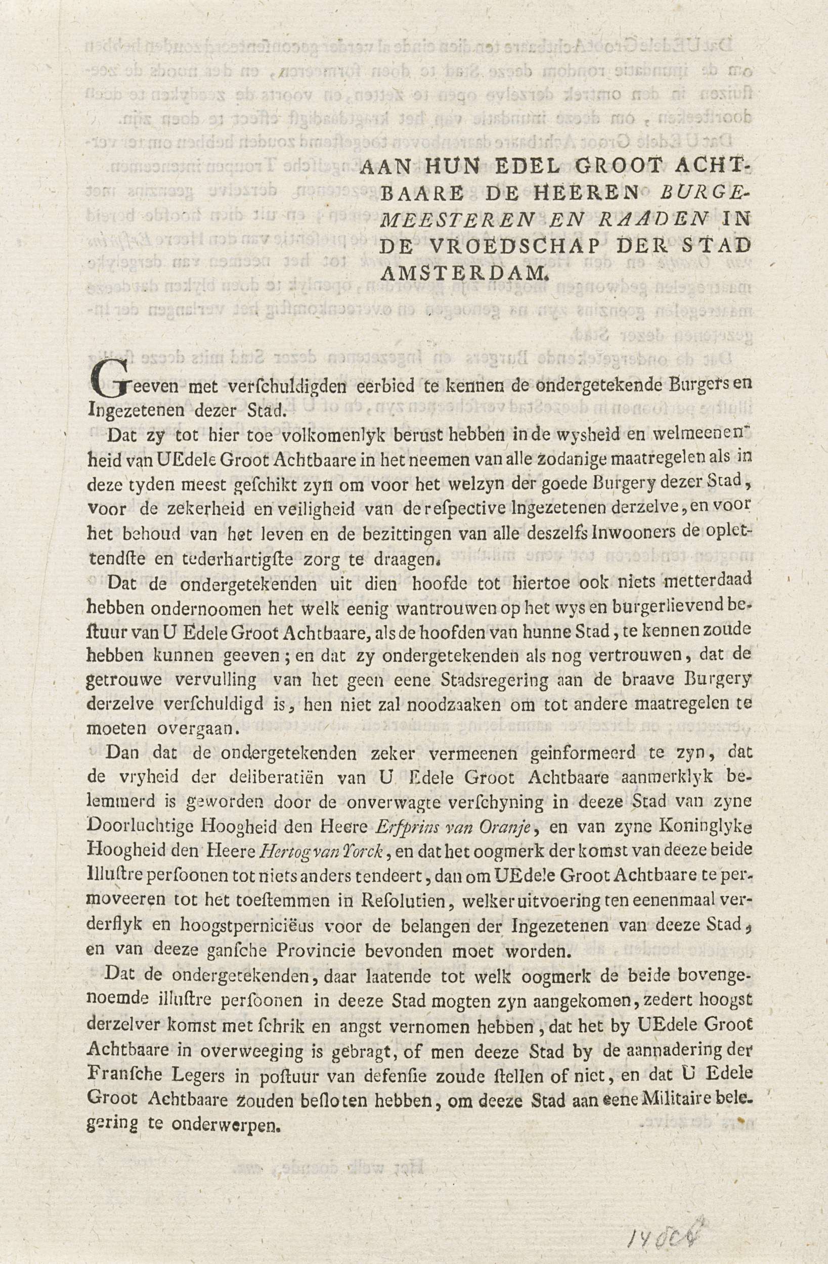 Request van een vertegenwoordiging van burgers aan de vroedschap van Amsterdam, 14 oktober 1794. In het stuk wordt geprotesteerd tegen vermeende plannen van de vroedschap om bij het naderen van het Franse leger Engelse troepen ter verdediging in de stad te nemen. Tekstblad bedrukt op beide zijden.