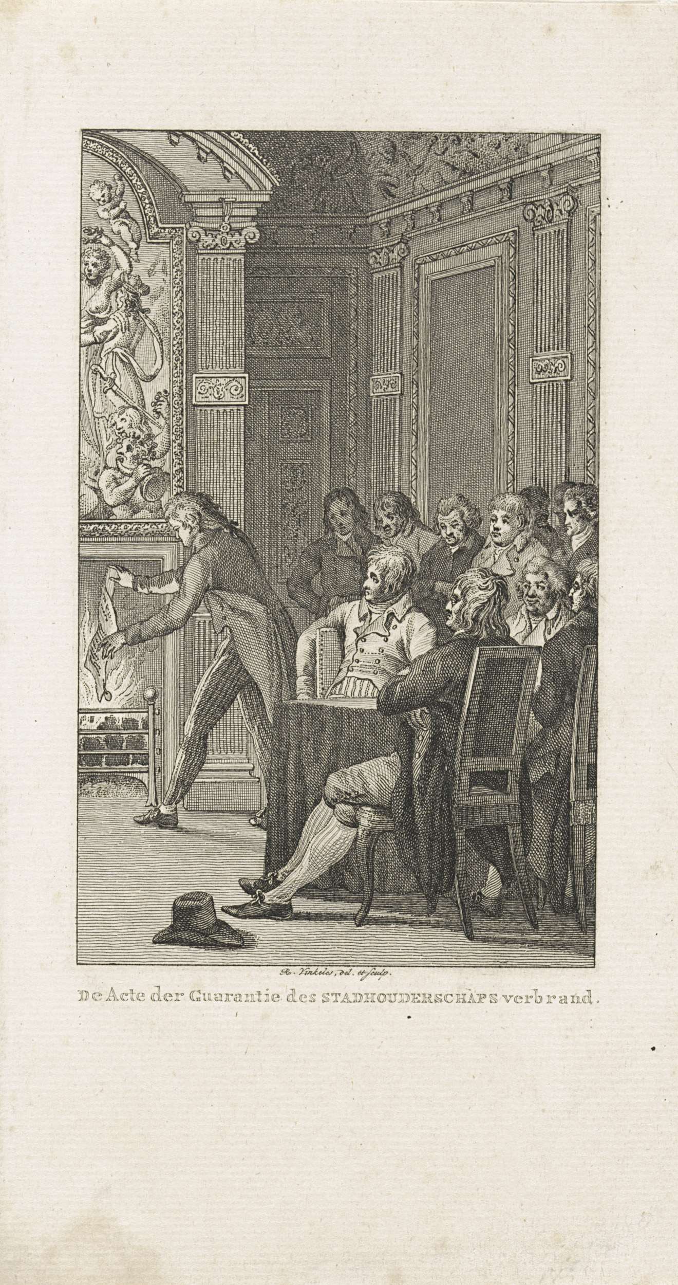 Commies Daniel van Laar verbrandt de Acte van Garantie, waarin de erfstadhouderschap gegarandeerd werd, in het haardvuur op de Kamer van Hunne Hoogmogenden, 16 februari 1795.