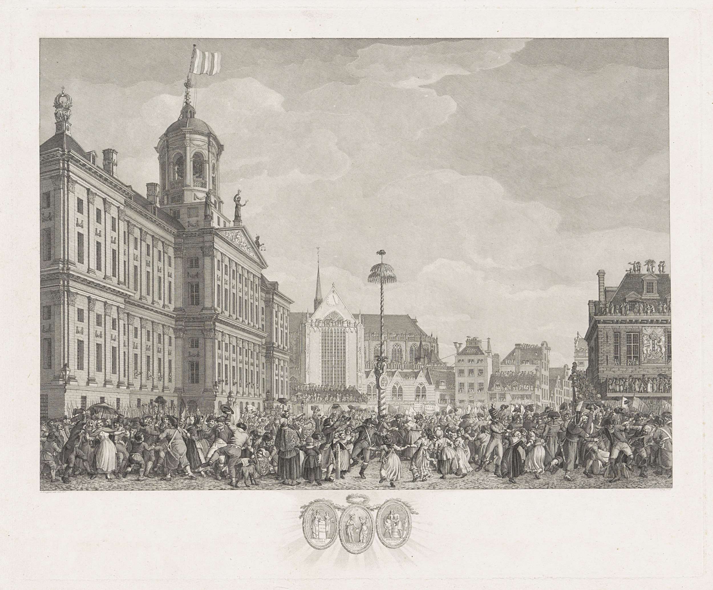 Feest der Vrijheid, gevierd bij de inwijding van de vrijheidsboom op de Dam te Amsterdam, 4 maart 1795. Gezicht op de Dam met een grote menigte dansend om de vrijheidsboom. In de marge de drie allegorische emblemen van Vrijheid, Gelijkheid en Broederschap die aan de boom hingen.