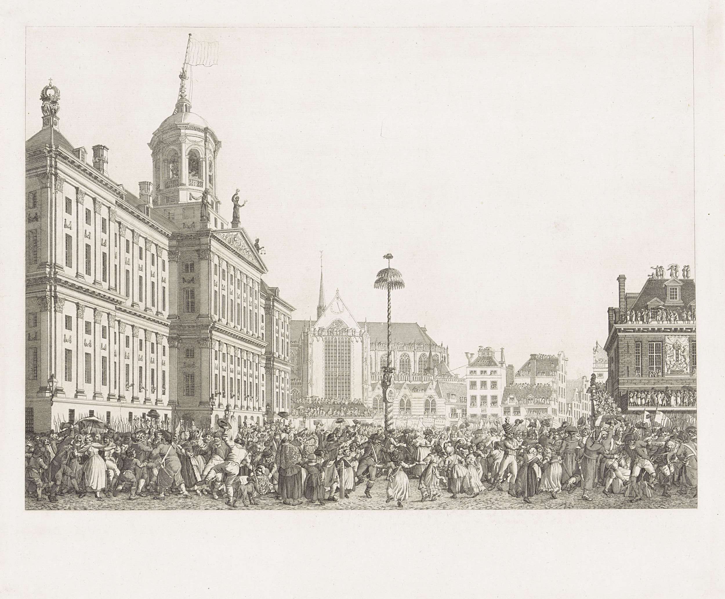 Feest der Vrijheid, gevierd bij de inwijding van de vrijheidsboom op de Dam te Amsterdam, 4 maart 1795. Gezicht op de Dam met een grote menigte dansend om de vrijheidsboom.