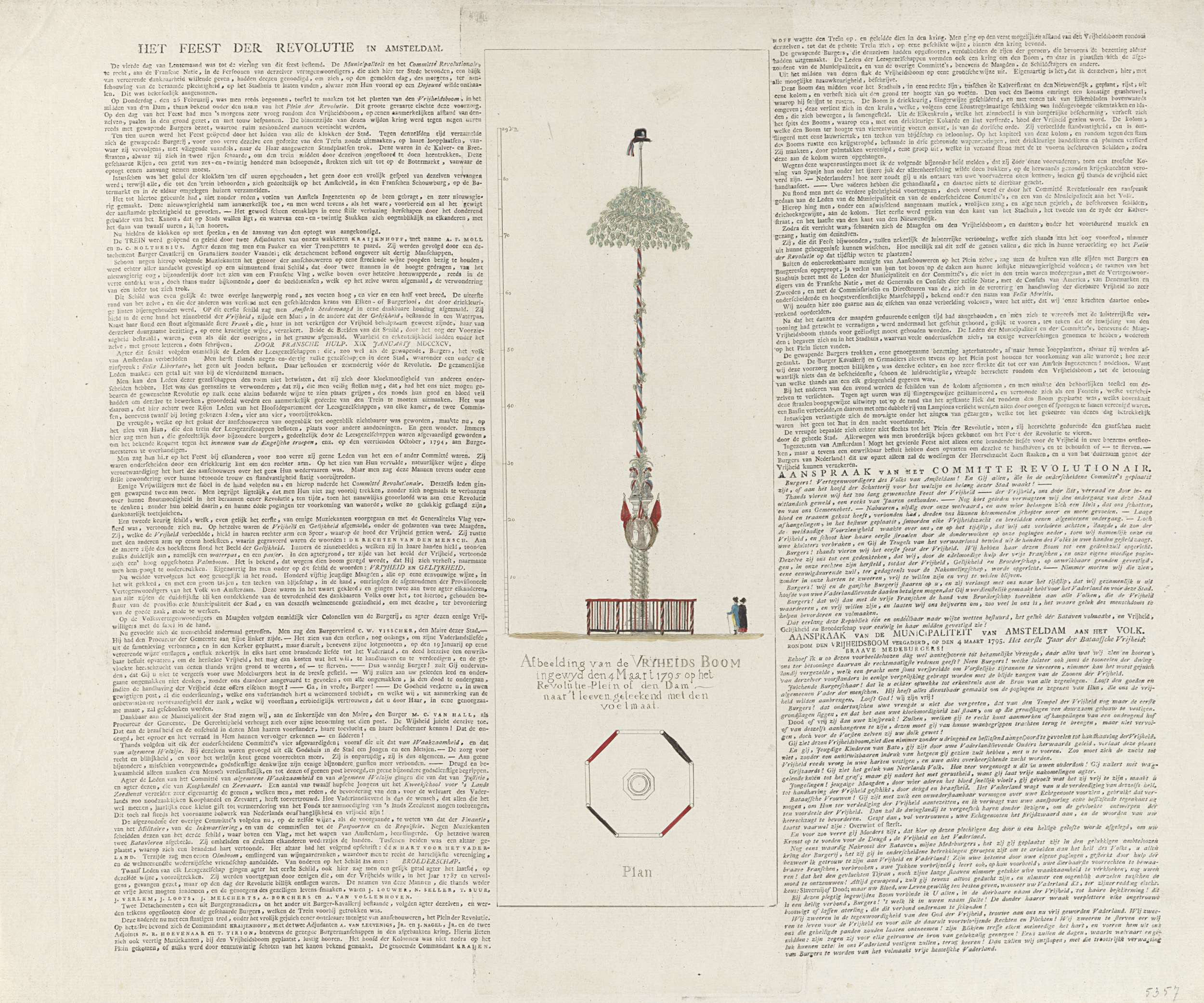 De vrijheidsboom ingewijd op de Dam, destijds Revolutieplein, te Amsterdam op 4 maart 1795. Blad met centraal de vrijheidsboom, aan weerszijden kolommen tekst.