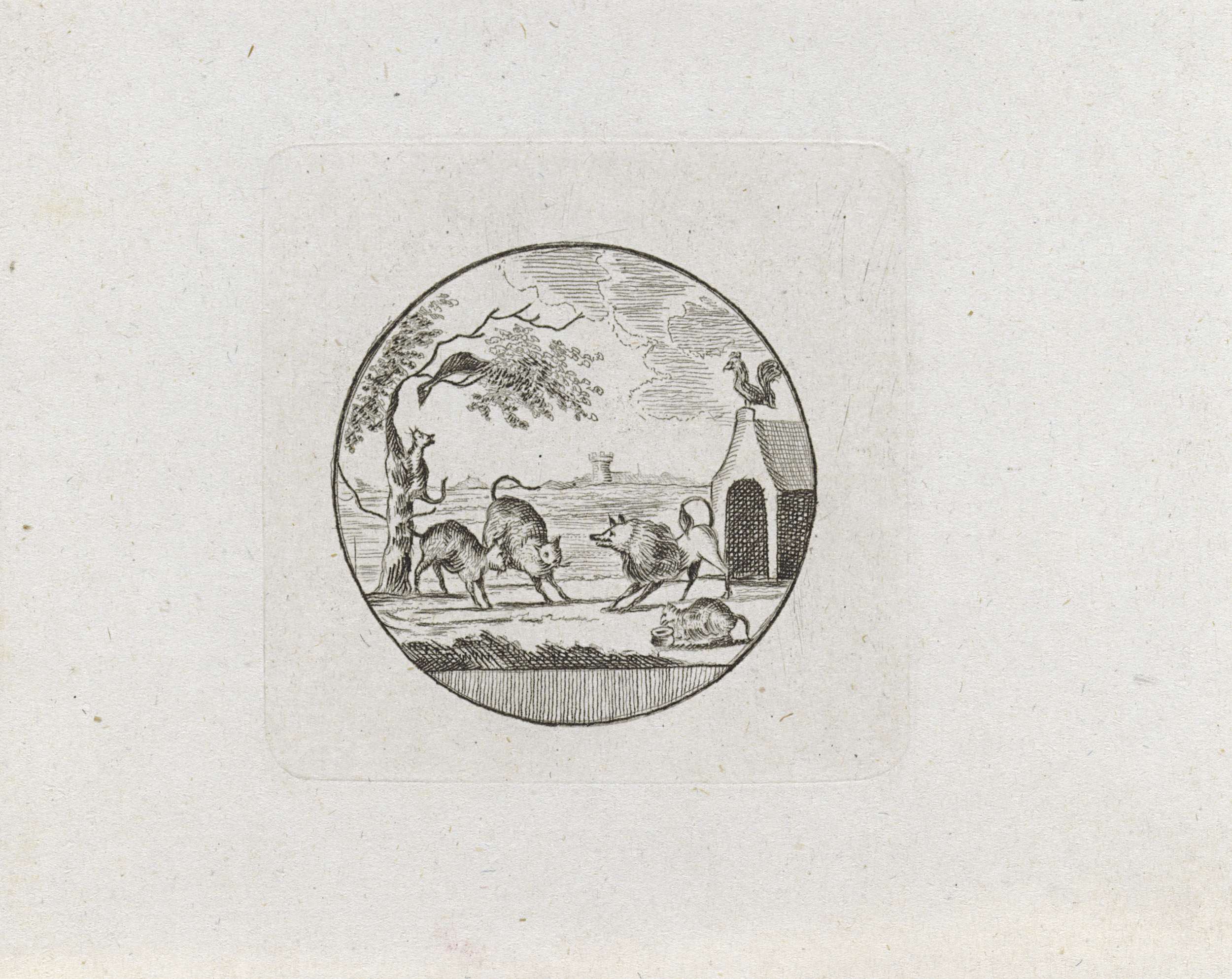 Rond vignet met een keeshond dat zijn hok verdedigt tegen twee katten, ca. 1787-1795. Op het hok zit de Franse haan.