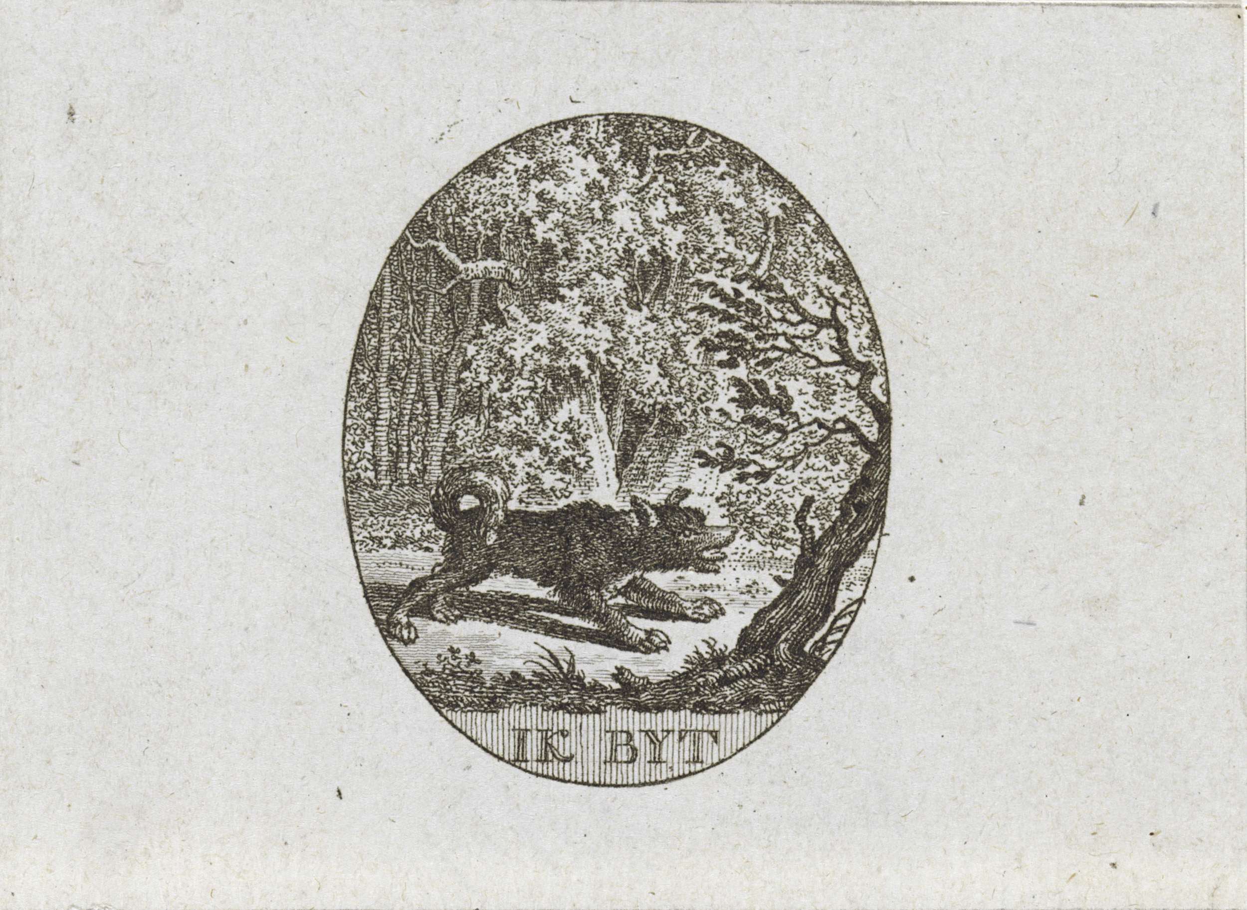 Een blaffende naar rechts gewende keeshond in een bos, in ovaal, ca. 1787. Met als onderschrift "Ik bijt".