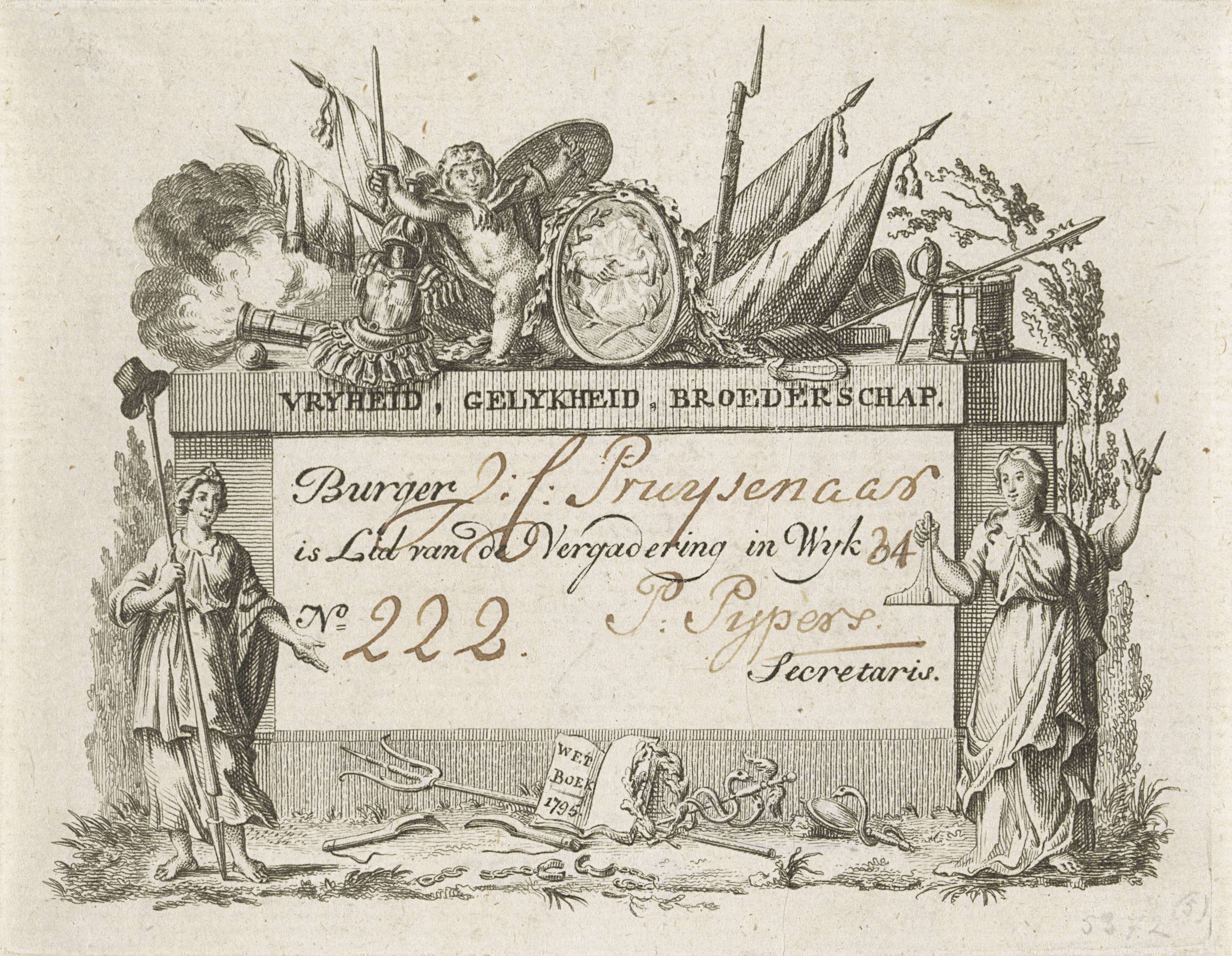 Voorgedrukt lidmaatschapsbewijs van de vergadering van de schutterij van wijk 34, te Amsterdam (?) 1795. Stenen voetstuk ingevuld met de naam van de burger J.C. Pruysenaar. Aan weerszijden de Vrijheid en de Gelijkheid, bovenop wapens.