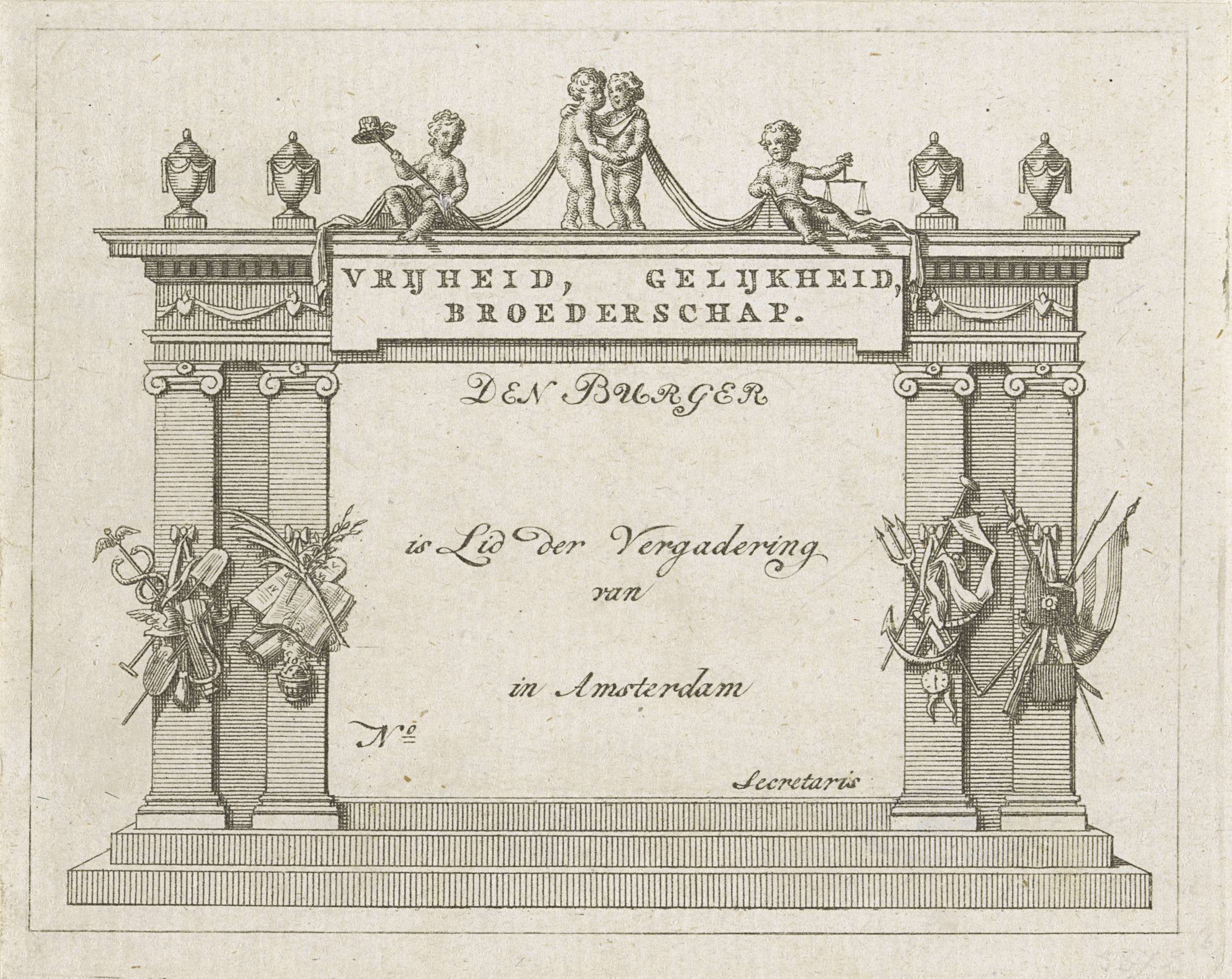 Voorgedrukt oningevuld lidmaatschapsbewijs van de vergadering van de schutterij van een wijk te Amsterdam, 1795. Stenen plaquette met pilasters en wapentrofeeën.