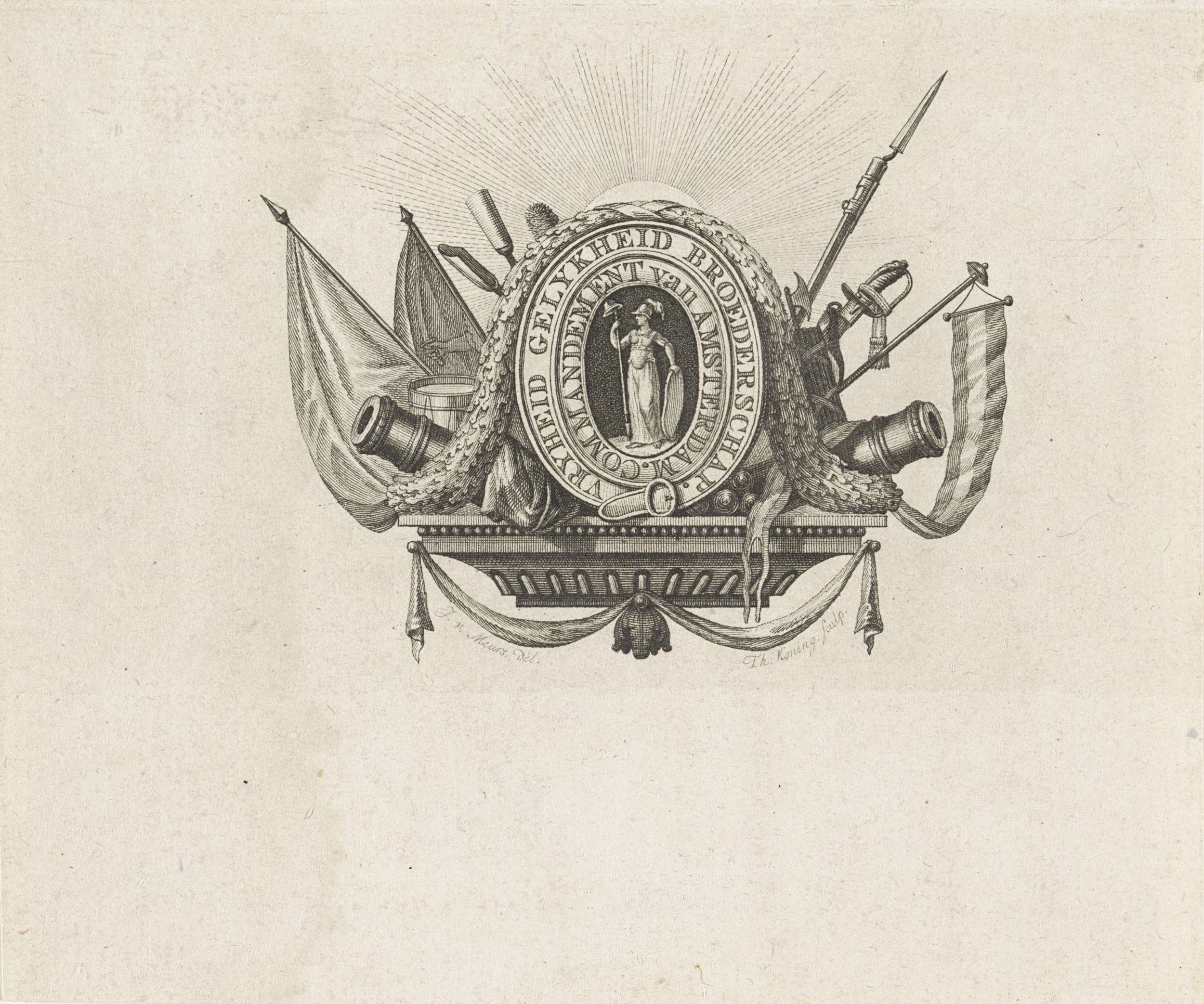 Ovaal vignet met wapentrofee. Centraal de Vrijheid omringd door een riem waarop het motto Vrijheid, Gelijkheid en Broederschap en de aanduiding 'commandement van Amsterdam', 1795.