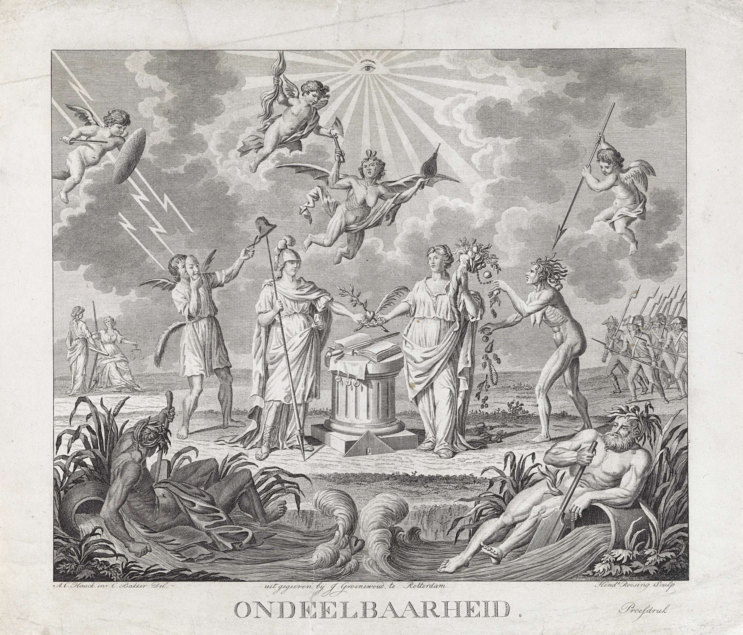Allegorie op de Ondeelbaarheid, 1795. Vrijheid en Overvloed staande naast een altaar. Deze Eenheid wordt bedriegd door List, Tweedracht en Nijd, maar beschermd door engelen en toesnellende burgerwacht. In de hemel het Alziende Oog, op de voorgrond twee riviergoden. Bij de prent behoort een blad met uitleg.