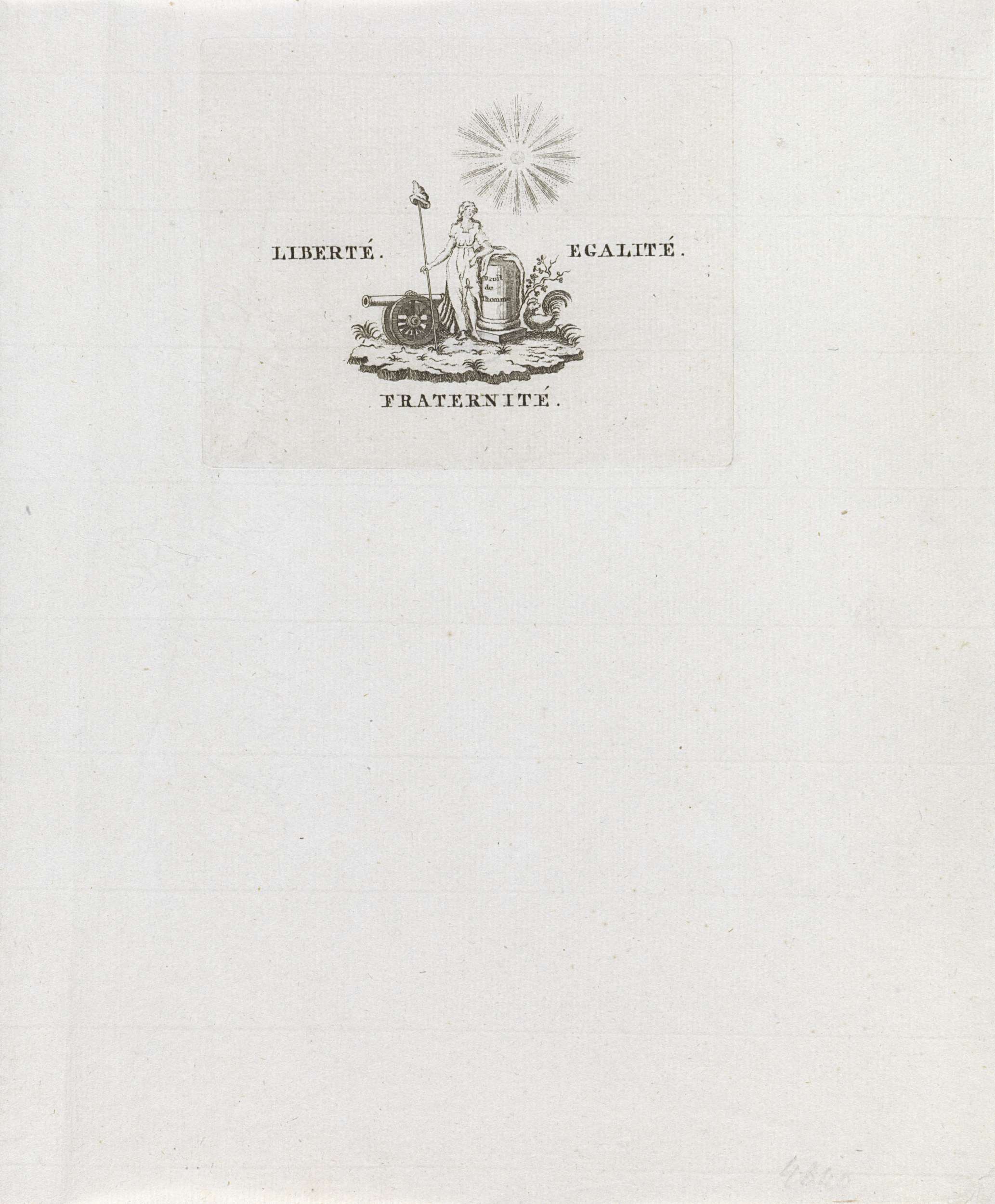 Dubbelgevouwen blanco briefpapier met bovenaan een allegorisch vignet als briefhoofd met opschrift 'Liberté, Egalité, Fraternité', 1795. Vignet met de Vrijheid staande bij een kanon en een altaar waarop 'Droit de l'homme', beschenen door zonnestralen.