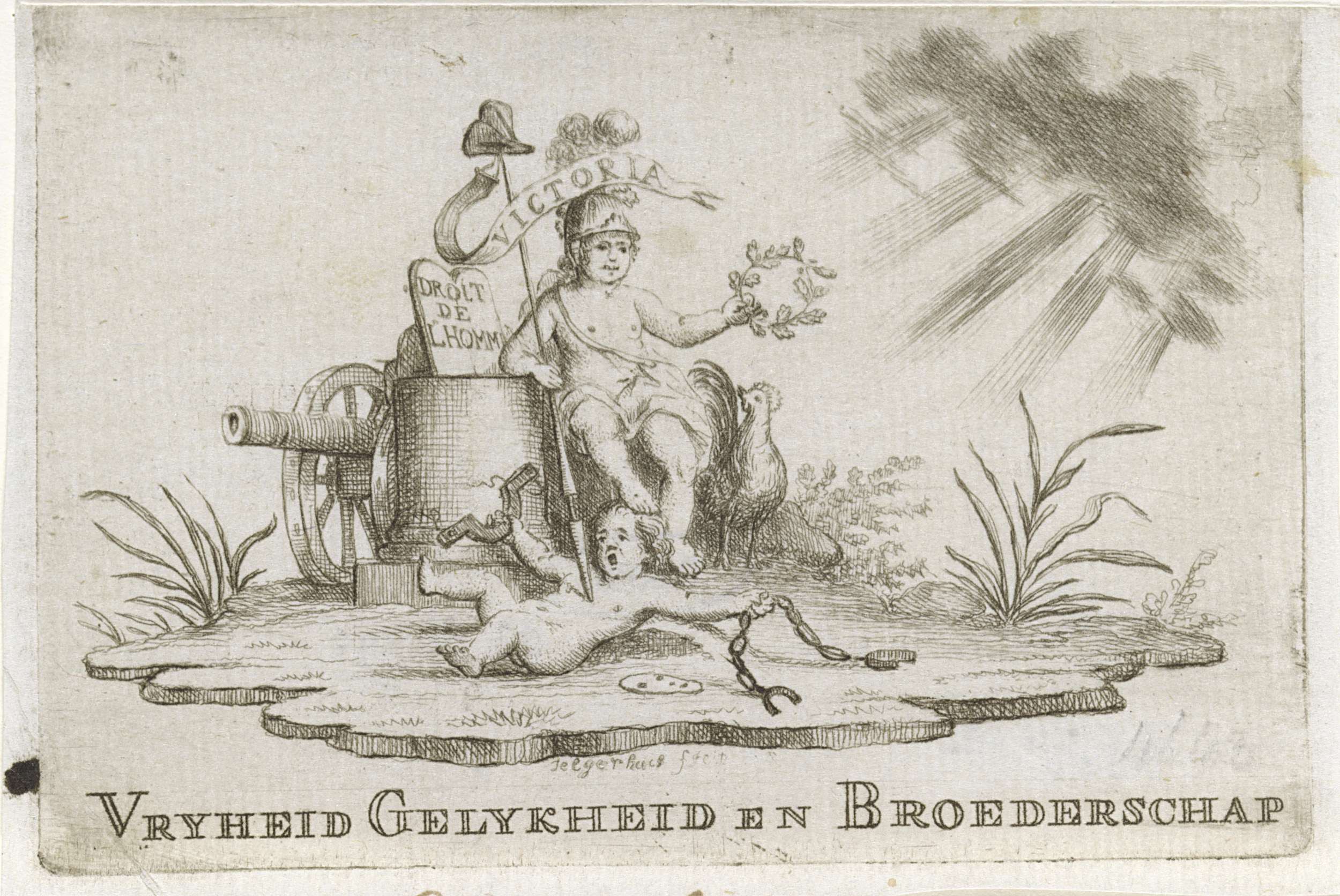 Patriots allegorisch vignet met een kind als de Vrijheid met lans met banier met opschrift 'Victoria', naast Franse haan en geleund tegen kanon en altaar waarop 'Droit de l'homme', ca. 1795. Rechts schijnt de zon door wolken. Aan haar voeten spartelt een ander kind met ketens en juk.