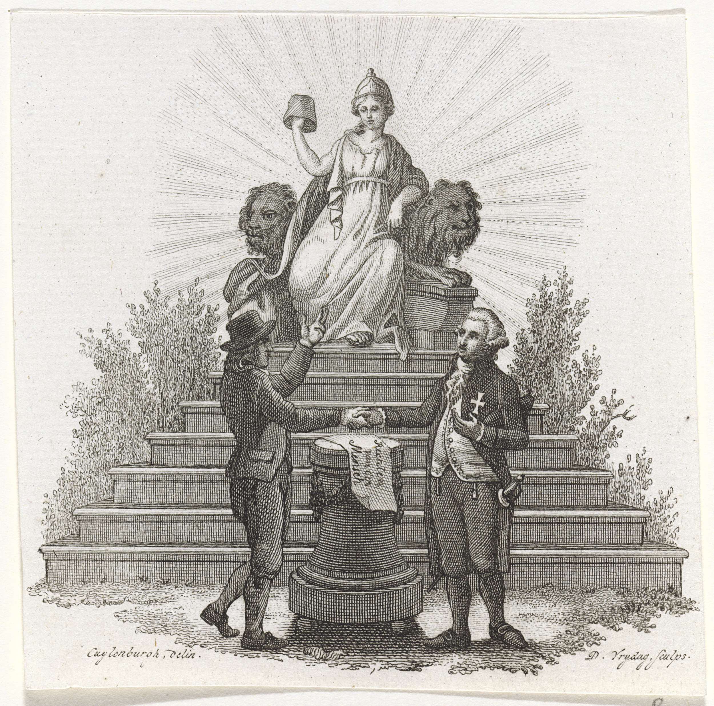 Patriots titelvignet op een titelpagina van 1799 waarin een burger en een edelman elkaar de hand schudden en de burger een eed aflegt op het altaar van de Rechten van de Mens. Op de achtergrond troont de Vrijheid of de Republiek tussen twee leeuwen.