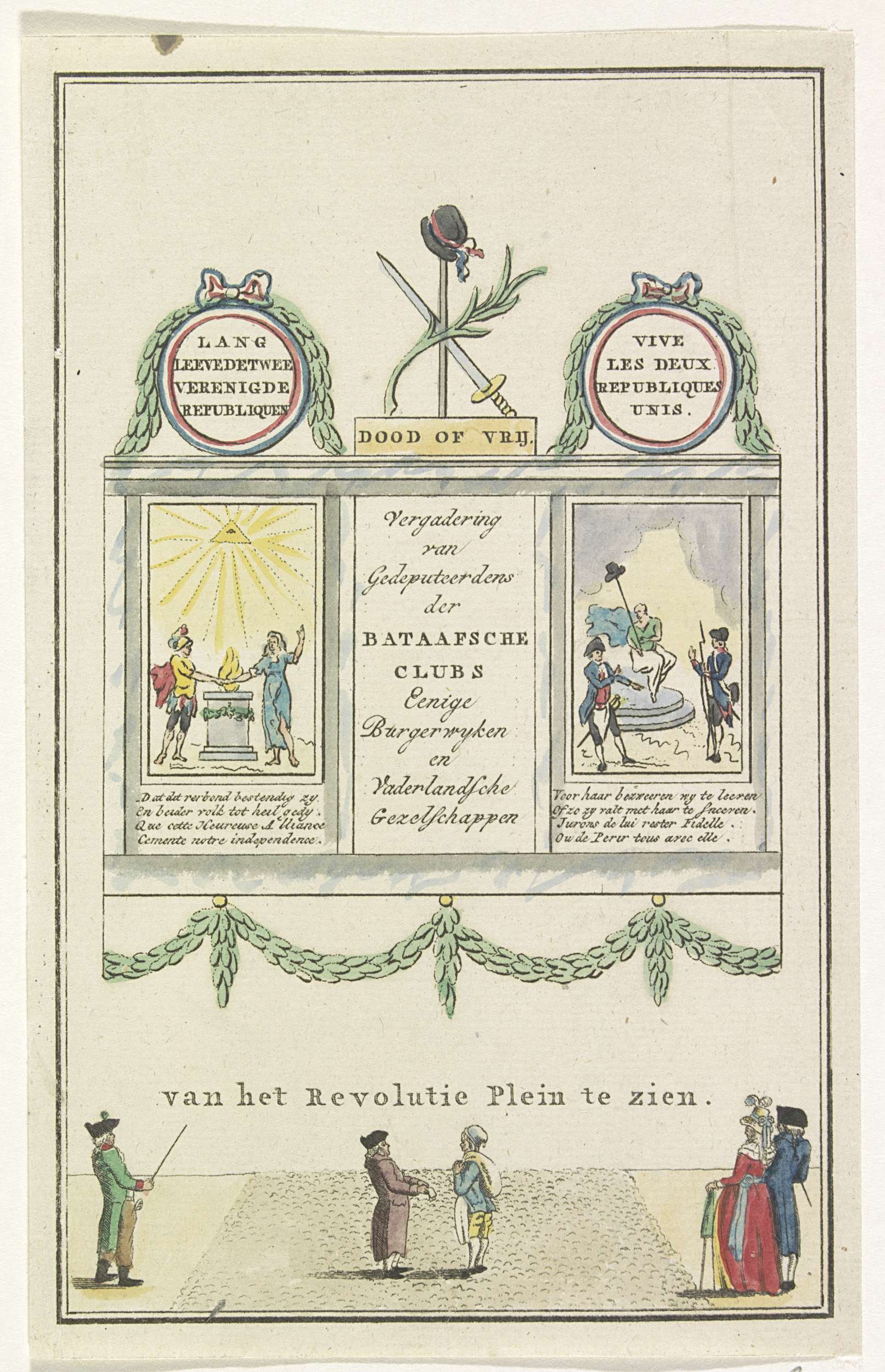 Decoratie in de Beurssteeg, gezien vanaf de Dam, 1795. Opgericht door een Vergadering van Gedeputeerden van de Bataafsche Clubs, Burgerwijken en Vaderlandsche Gezelschappen te Amsterdam. Met enkele figuren. Uit het boekje met afbeeldingen van de versieringen opgericht in de stad bij de viering van de installatie van de representanten en de alliantie gesloten tussen de ...