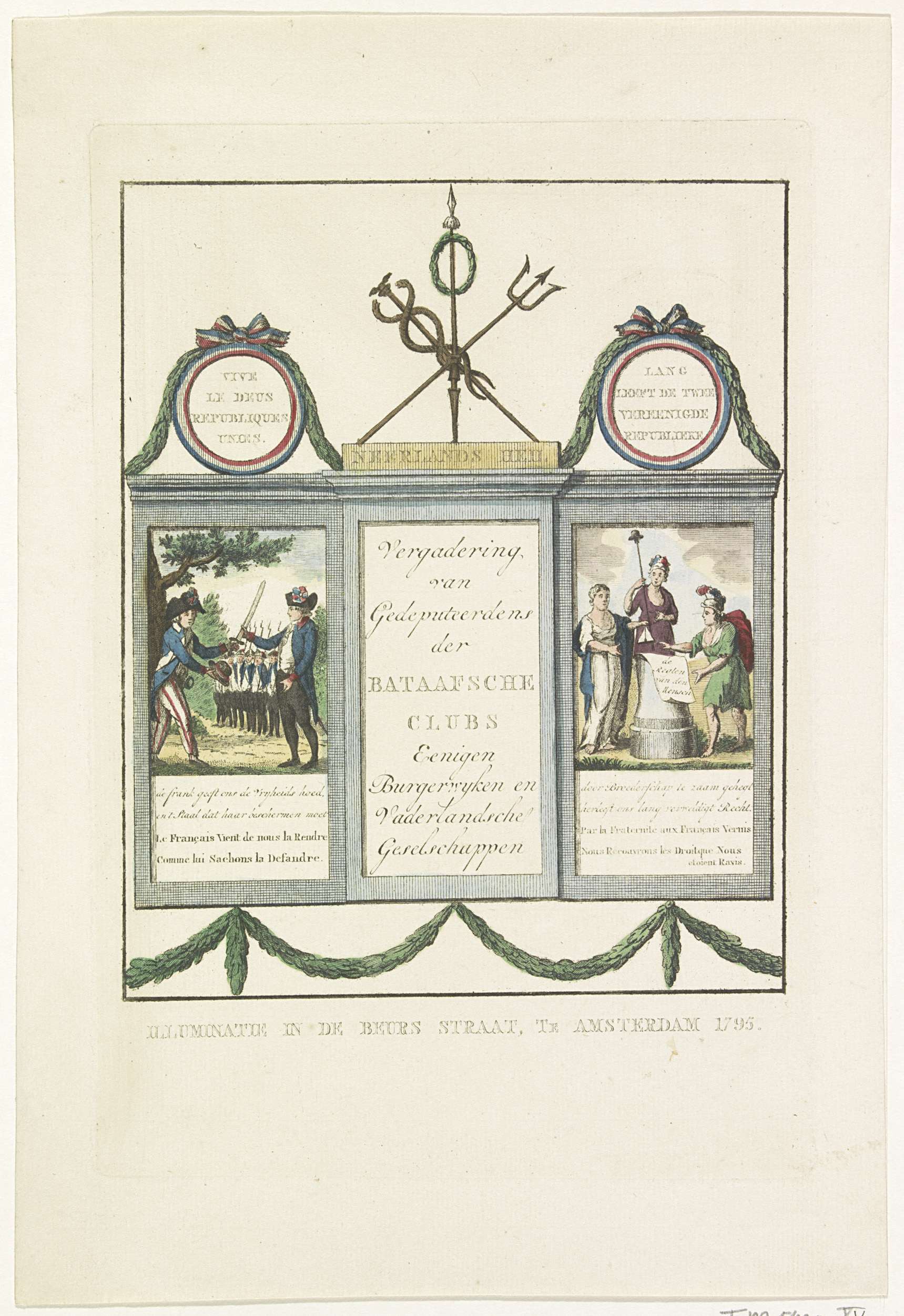 Decoratie in de Beurssteeg te Amsterdam, gezien vanaf het Rokin, bij het Alliantiefeest op 19 juni 1795. Opgericht door een Vergadering van Gedeputeerden van de Bataafsche Clubs, Burgerwijken en Vaderlandsche Gezelschappen te Amsterdam. Onderdeel van een serie van dertien platen.