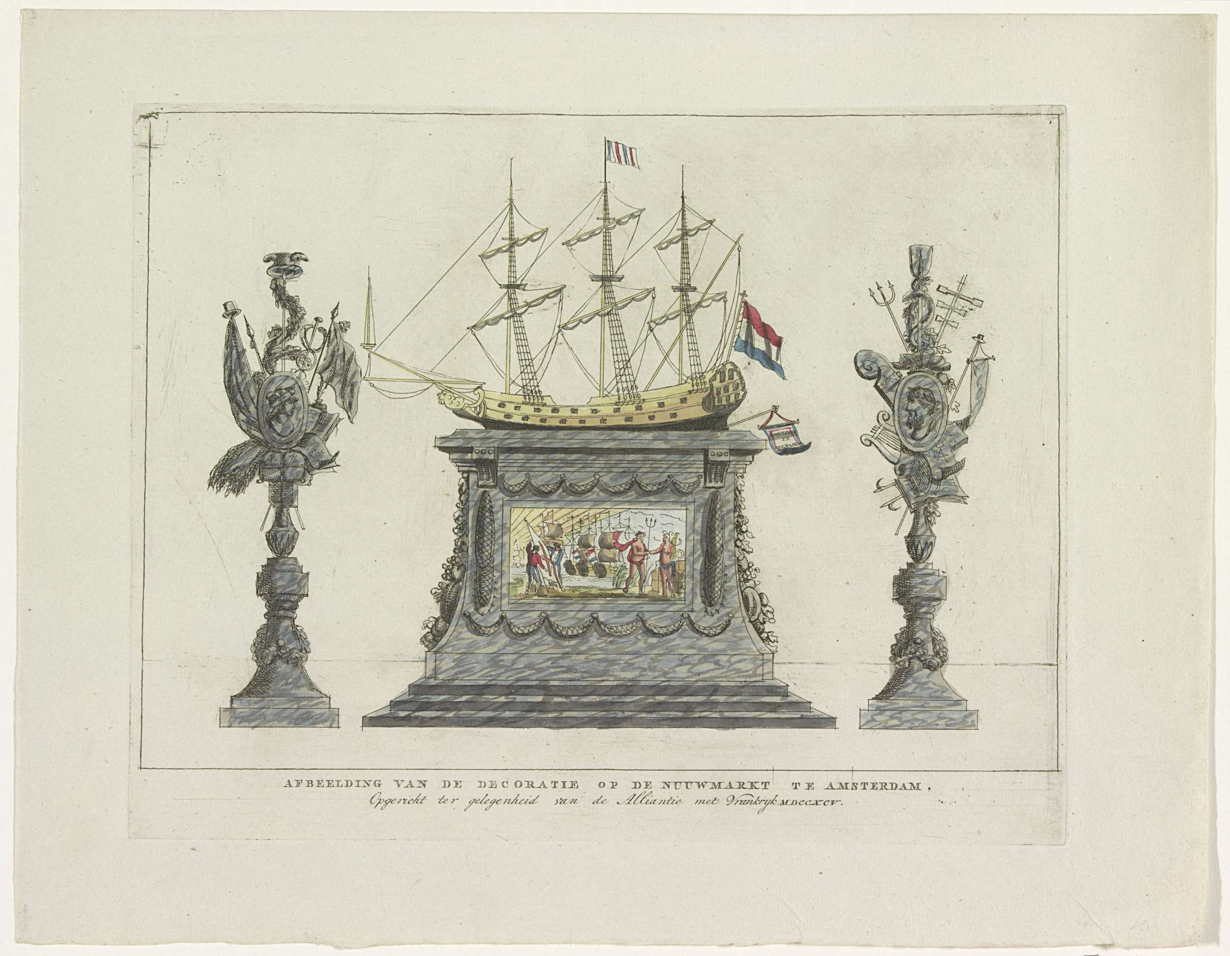 Koophandel en Zeevaart, allegorische decoratie opgericht in de Nieuwmarkt te Amsterdam bij het Alliantiefeest op 19 juni 1795. Reusachtig model van een koopvaardijschip op een voetstuk met chassinet met voorstelling van Neptunus en Mercurius die elkaar de hand schudden terwijl de Franse en Bataafse matroos de Britse vlag aan stukken scheuren. Onderdeel van een serie ...