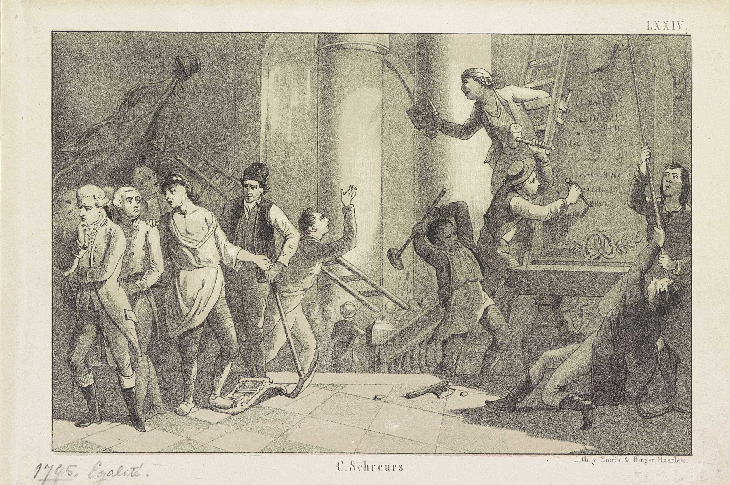 Onder het mom van 'Egalité' worden adellijke graven in een kerk vernield, 1795. Genummerd rechtsboven: LXXIV.