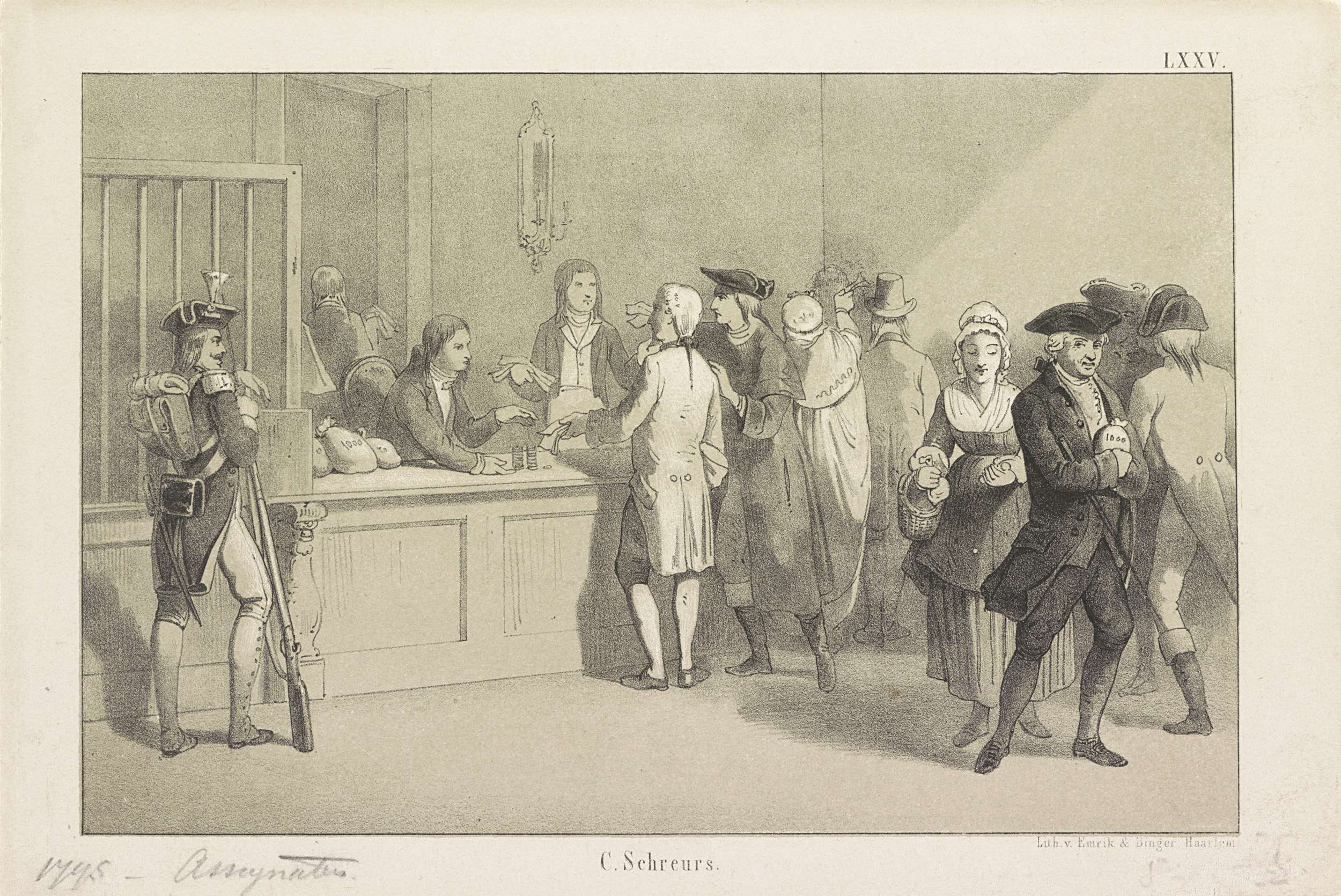 Op een bankkantoor proberen klanten hun assignaten om te ruilen voor contant geld, 1795. Genummerd rechtsboven: LXXV.