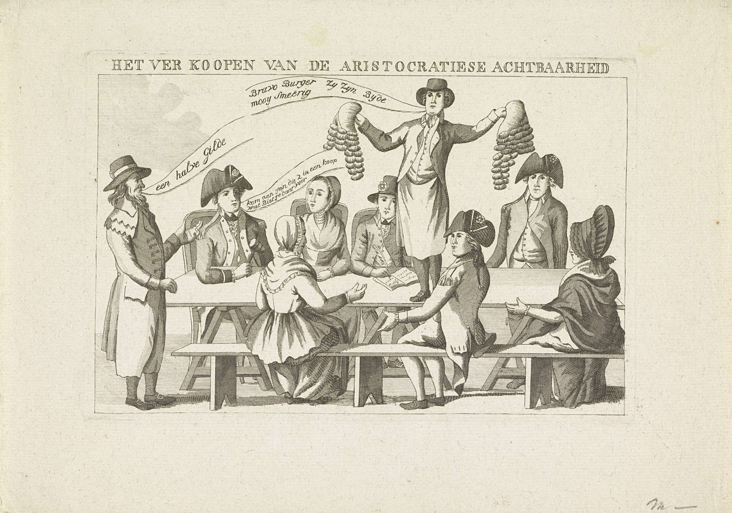 Spotprent op de Aristocratie, 1795. Openbare verkoping of veiling door Franse soldaten van pruiken. Een verkoper houdt twee pruiken te koop omhoog. Links biedt een staande jood op de pruiken. Zie ook pendant.