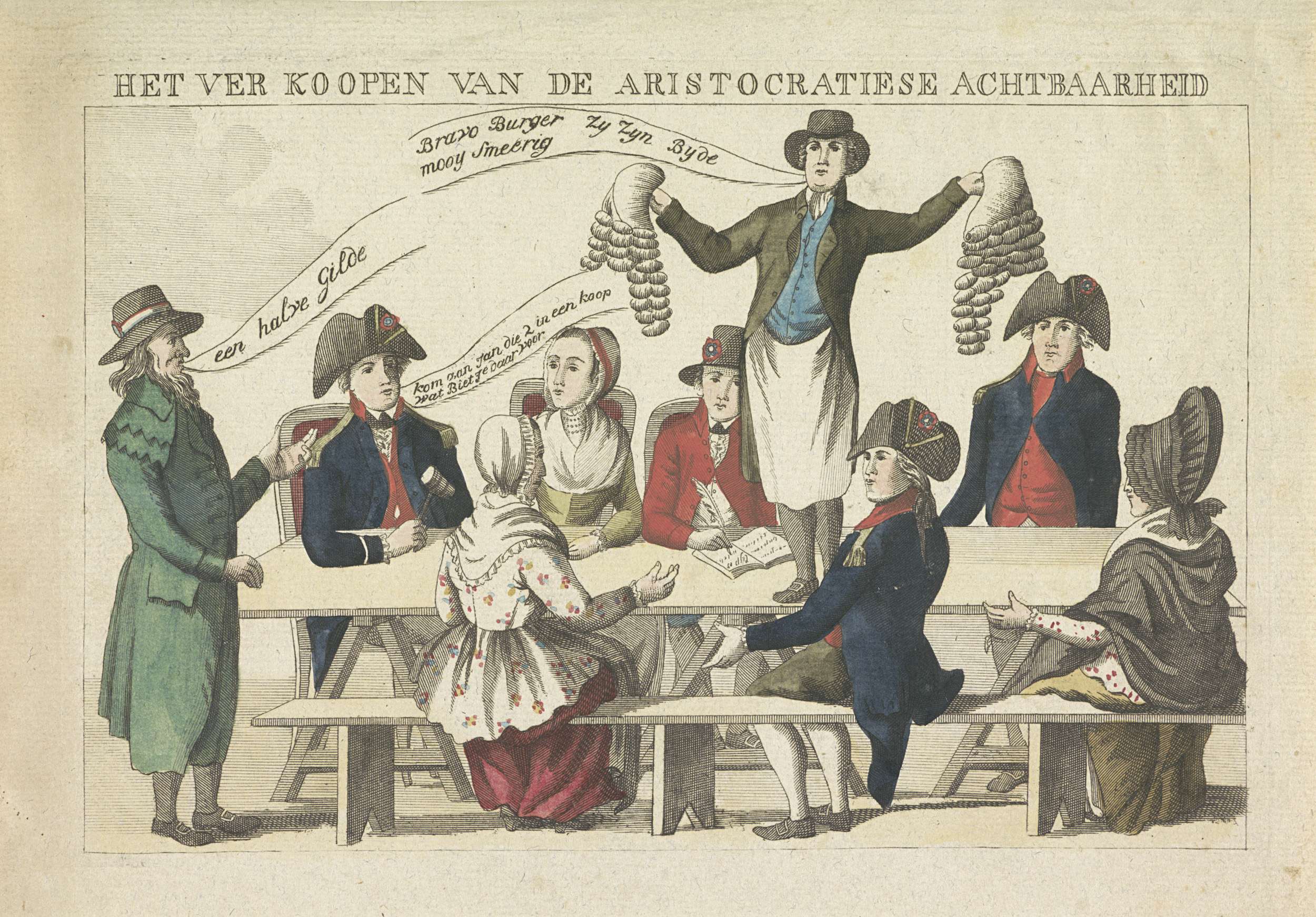 Spotprent op de Aristocratie, 1795. Openbare verkoping of veiling door Franse soldaten van pruiken. Een verkoper houdt twee pruiken te koop omhoog. Links biedt een staande jood op de pruiken. Zie ook pendant.