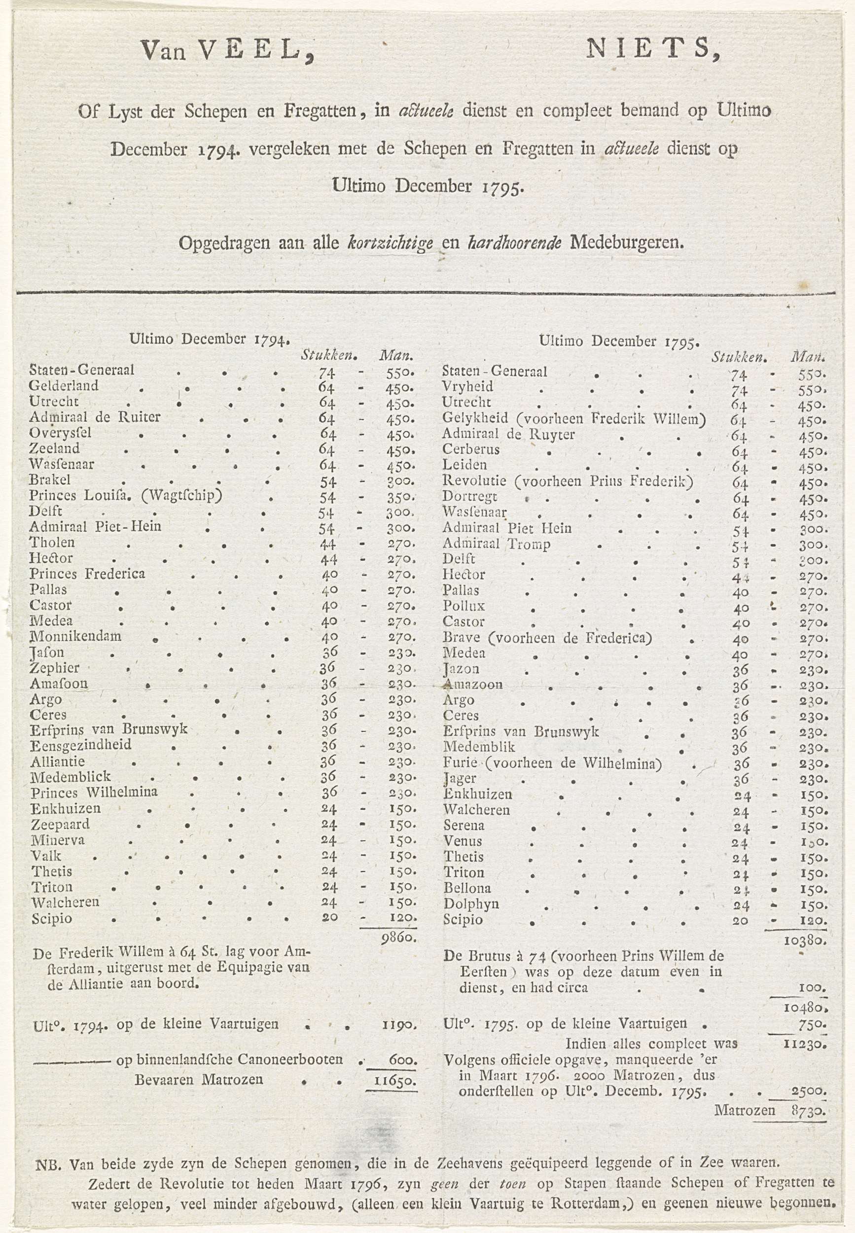 Tekstblad met in twee kolommen een vergelijking van de Nederlandse schepen en fregatten nog in dienst zijnde in december 1794 en in december 1795. Lijsten van namen van de schepen met de bijbehorende aantallen stukken en manschappen. Opgedragen aan 'alle kortzichtige en hardhoorende Medeburgeren'.