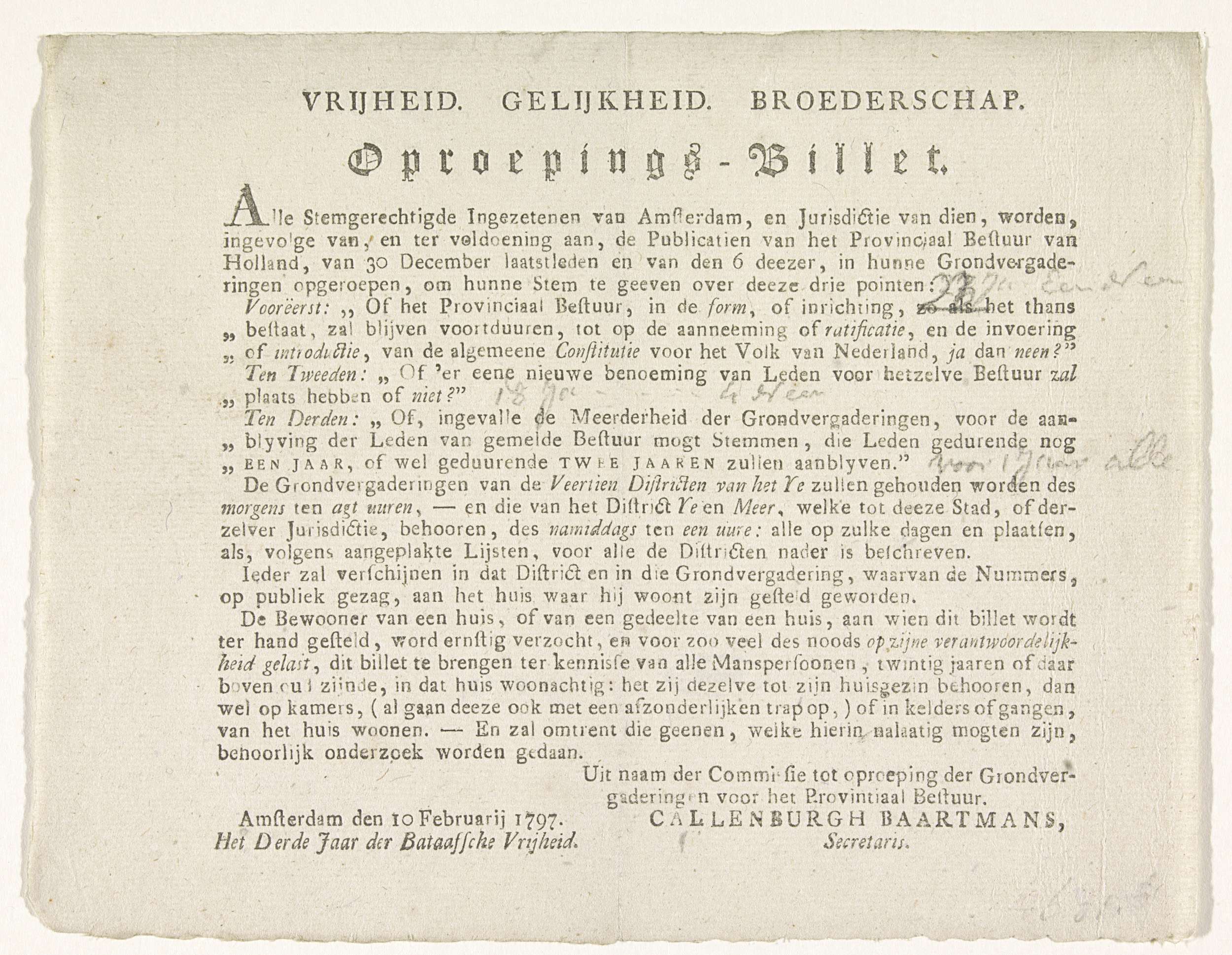 Oproepkaart aan alle stemgerechtigde Amsterdammers om te stemmen voor de voorlopige voortzetting van het Provinciaal Bestuur in de huidige vorm. Door Callenburgh Baartmans, secretaris van de 'Commissie tot oproeping der Grondvergaderingen voor het Provintiaal Bestuur', Amsterdam 10 februari 1797.