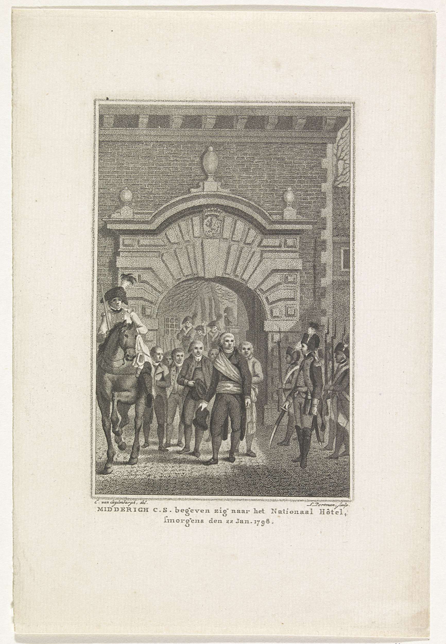 Voorzitter Johannes Henricus Midderigh loopt door de poort op weg naar de Nationale Vergadering, 22 januari 1798.